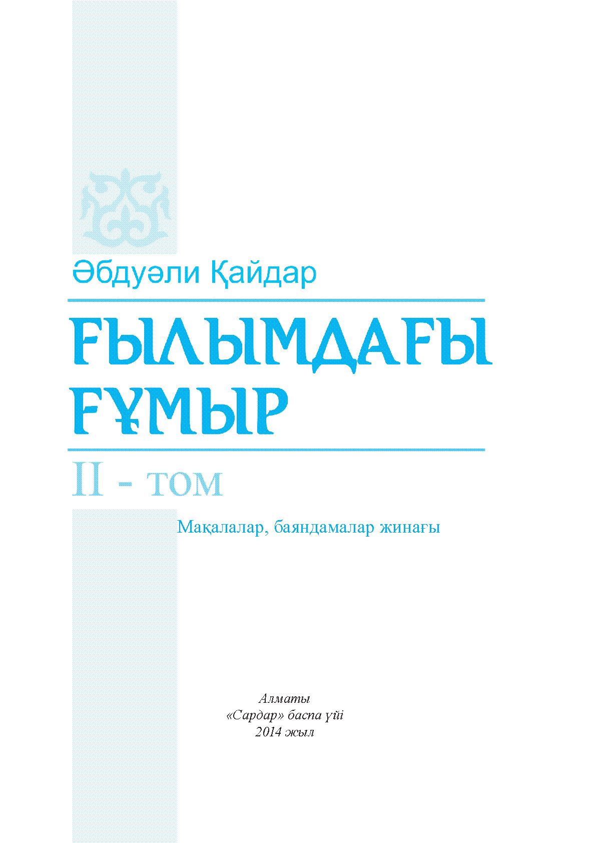 Ғылымдағы [Мәтін] / Ә. Қайдар ; ҚР мәдениет және спорт министрлігі .- Алматы : Сардар , 2014.– 4 000 дана . – 978-601-7174-44-6, 978-601-7174-42-2 (мұқ.) - ҚР тілдерді дамыту мен қолданудың 2011-2020 жылдарға арн. мем. бағд. аясында шығ. ; мәтіні қазақ және орыс тілд. . 2-т. . Мақалалар, баяндамалар жинағы– 509, [2] б., портр. . (мұқ.) : 50 тг.