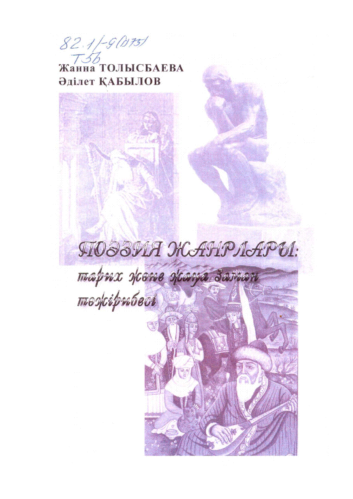 Поэзия жанрлары: тарих және жаңа заман тәжірибесі [Text] : жоғары оқу орындары филология бөлімдерінің студенттеріне арналған оқу құралы / Ж. Ж. Толысбаева Қабылов Ә. Д. ... – Семей : Талант, 2008. - 302 б. . . – [т. ж.] – 978-601-7037-24-6 : [б. ж.]