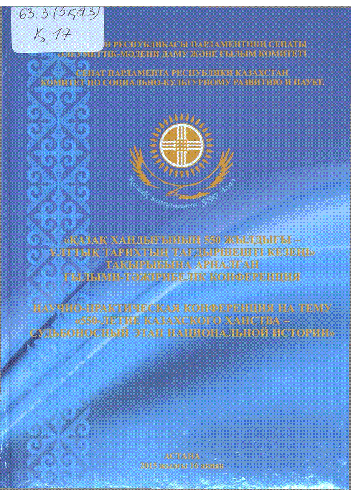 "Қазақ хандығының 550 жылдығы - ұлттық тарихтың тағдыршешті кезеңі" тақырыбына арналған ғылыми-тәжірибелік конференция материалдарының жинағы = Сборник материалов научно-практической конференции на тему: "550-летие Казахского ханства - судьбоносный этап национальной истории" [Мәтін] : 2015 жылғы 16 ақпан / ; [жауап.: Н.М. Оразалин, Р.Е. Дүйсенов], ҚР Парламентінің сенаты, Әлеуметтік-мәдени даму және ғылым комитеті... – Астана : [б. ж.], 2015. - 151 б., суретті;– (Қазақ хандығына 550 жыл. - Мәтін қазақ, орыс тілд. . – Библиогр. бөлім соңында . – 300 дана – 978-601-280-617-5 : 20 тг.