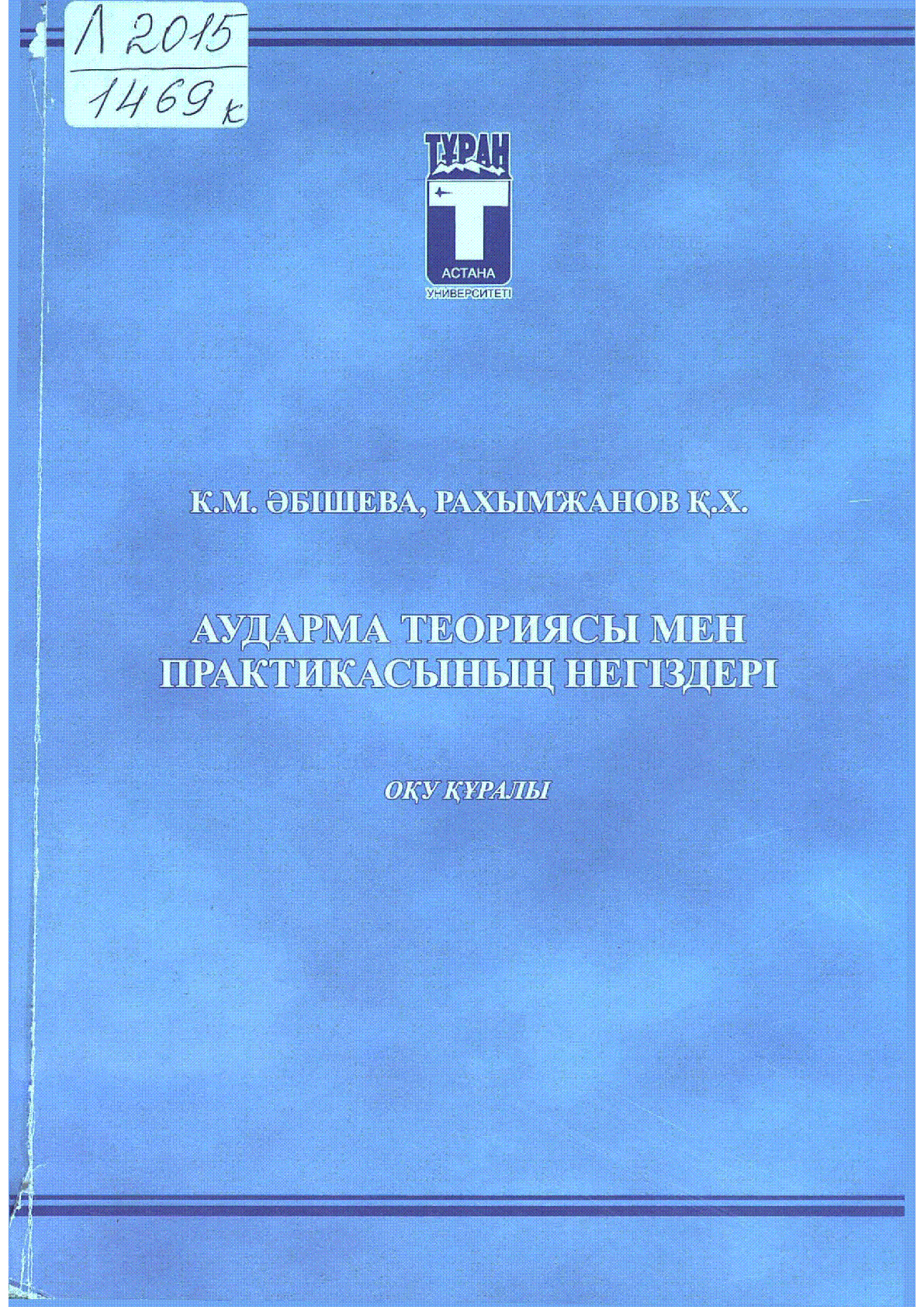 Аударма теориясы мен практикасының негіздері [Text] : оқулық / Әбішева, Клара Мухамедиярқызы Рахымжанов, Қанат Хисматұлы ; ҚР Білім және ғылым министрлігі ; "Тұран-Астана" университеті ; Қазіргі лингвистикалық білім... – Астана : [б. ж.], 2011. - 242 б. . – Тақырып асты библиогр. . – 3 000 дана – 978-601-214-053-8 : 30 тг.