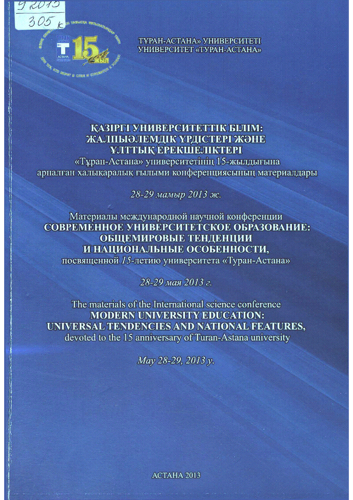 Қазіргі университеттік білім: жалпыәлемдік үрдістері және ұлттық ерекшеліктері = Современное университетское образование: общемировые тенденции и национальные особенности = Modern university education:universal tendencies and national features [Text], [Text] : 28-29 мамыр 2013 ж. : "Тұран-Астана" университетінің 15-жылдығына арналған халықаралық ғылыми конференциясының материалдары / ; "Тұран-Астана" ун-ті, [ред. алқасы: Г.А. Джапарова [ж.б.]]... – Астана : [б. ж.], 2013. - 463 б. - қазақ, орыс және ағылш. тілд. . – Библиогр. мақала соңында . – 500 дана – 978-601-214-214-3 : 30 тг.