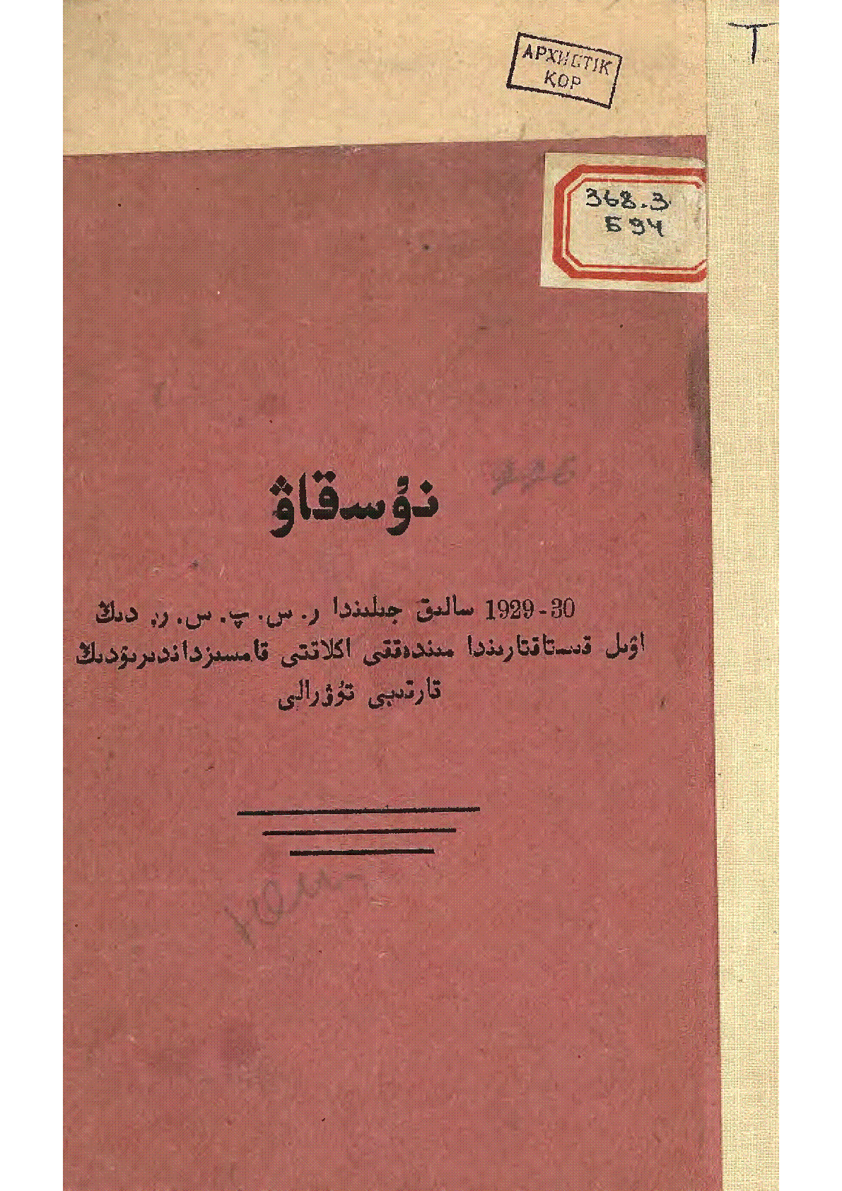1929-1930 салық жылында РСФСР-дың ауыл қыстақтарында міндетті окладты қамсыздандырудың тәртібі туралы нұсқау [Мәтін] / ... – Ташкент : Типо-лит. №2, 1929. - 102 б. - Мәтін араб графикасымен жазылған . . – 2000 дана