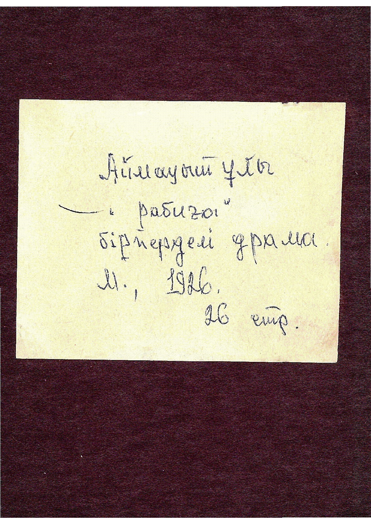 Рабиға = رابىيعا [Мәтін] : Бір перделі драма / Ж. Аймауытұлы ... – Мәскеу : Қазақстан мемлекет баспасының күншығыс бөлімі, 1926. - 26 б. - Мәтін араб графикасымен жазылған . . – 3000 дана
