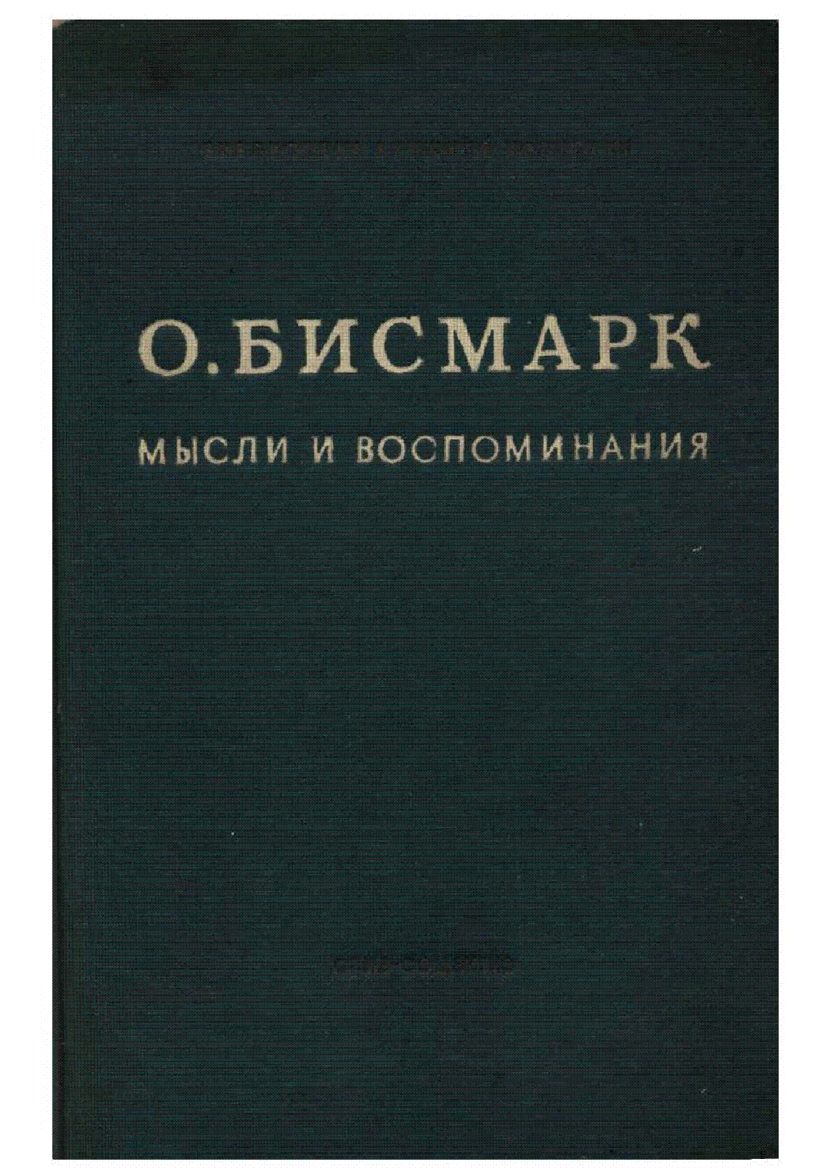 Мысли и воспоминания [Текст] / О. Бисмарк ; пер. с нем. А. С. Ерусалимского .- Москва : ОГИЗ : СОЦЭКГИЗ , 1940. – Библиотека внешней политики.– [б. т.] . (в пер.) - Құнды тарту 2015 . Библиогр. в пристроч. примеч. Т. 1 .– 336 с. (в пер.) : 100 тг.