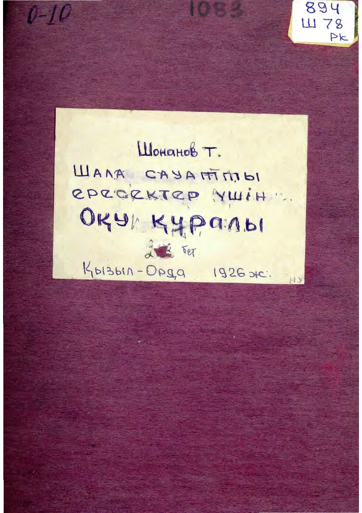 Шала сауатты ересектер үшін оқу құралы = شالا ساۋاتتى ه ره سه كته ر ٶشىن وقىۋ قۇرالى [Мәтін] / Шонанұлы Т. ... – Қызылорда : Қазақстан мемлекет баспасы, 1926. - 207 с. - Араб графикасы. . . – 20 000 дана