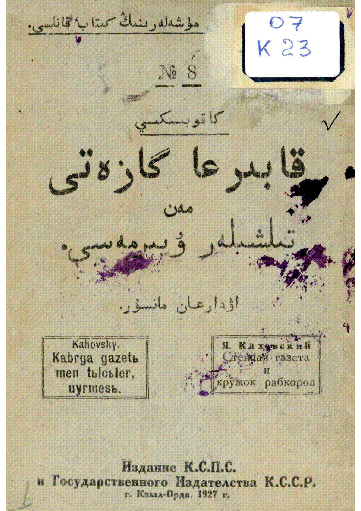 Қабырға газеті мен тілшілер үйірмесі = قابىرغا گازﻩ تى مه ن تىلشىله ر ﯘيىرمه سى [Мәтін] : ауд. Мансұр / Каховский Я ... – Қызылорда : Қазақстан мемлекет баспасы, 1927. - 44 б. - Араб графикасы. . . – 2000 дана