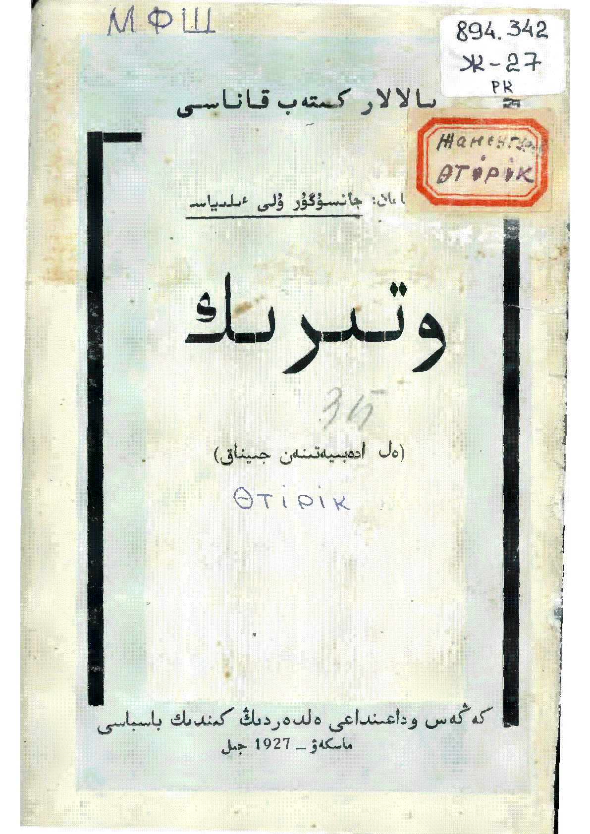 Өтірік = وتىرىك [Мәтін] : ел әдебиетінен жинақ / ; [жинаған І. Жансүгірұлы]... – Мәскеу : Кеңестер одағындағы елдердің кіндік баспасы, 1927. - 94 б.– (Балалар кітапханасы. - Мәтін араб қарпімен қазақ тілінде . . – 4500 дана