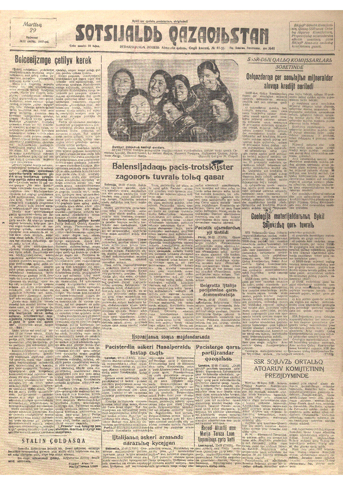Социалды Қазақстан. 1937 ж. = Sozsialdь Qazaqьstan : 29-март, 1937 ж.. – Алматы : [Казместпром], 1937. - .– [т.ж.]. №72 (4376). - [т.ж.]