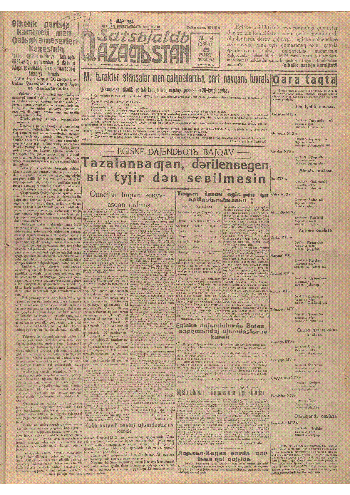 Социалды Қазақстан. 1934 ж. = Sozsialdь Qazaqьstan : 5-март, 1934 ж.. – Алматы : [Казместпром], 1934. - .– [т.ж.]. №54 (2865). - [т.ж.]