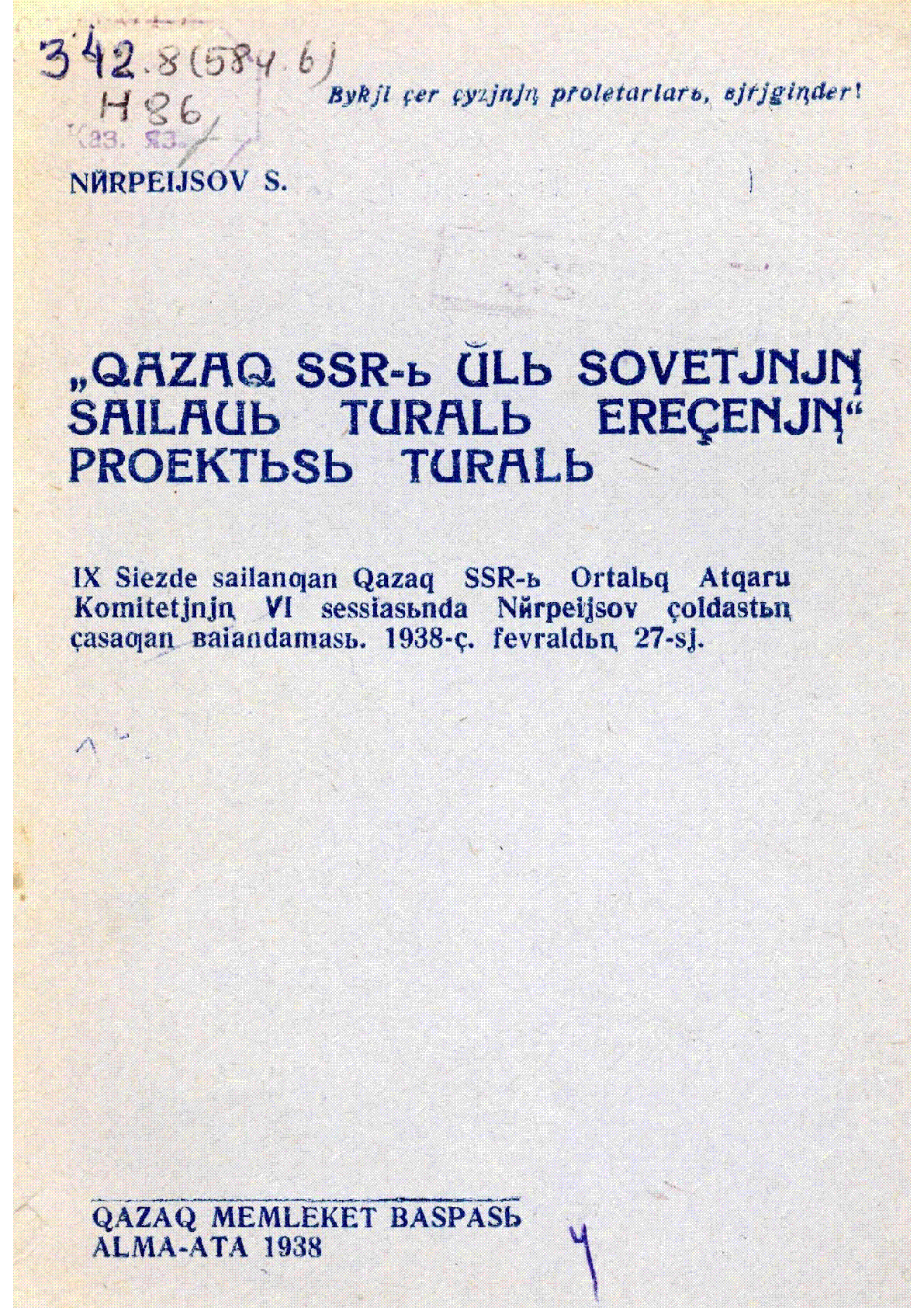 "Қазақ ССР Ұлы советінің сайлауы туралы Ереженің" проектісі туралы [Text] : IX сьезде сайланған Қазақ ССР ОАК-нің VI сессиясында жасаған баяндамасы, 27 февр.1938 ж. / Нұрпейісов С. ... – Алматы : Қазақ мемлекеттік баспасы, 1938. - 20 б. - Латын графикасы. . . – 30150 дана
