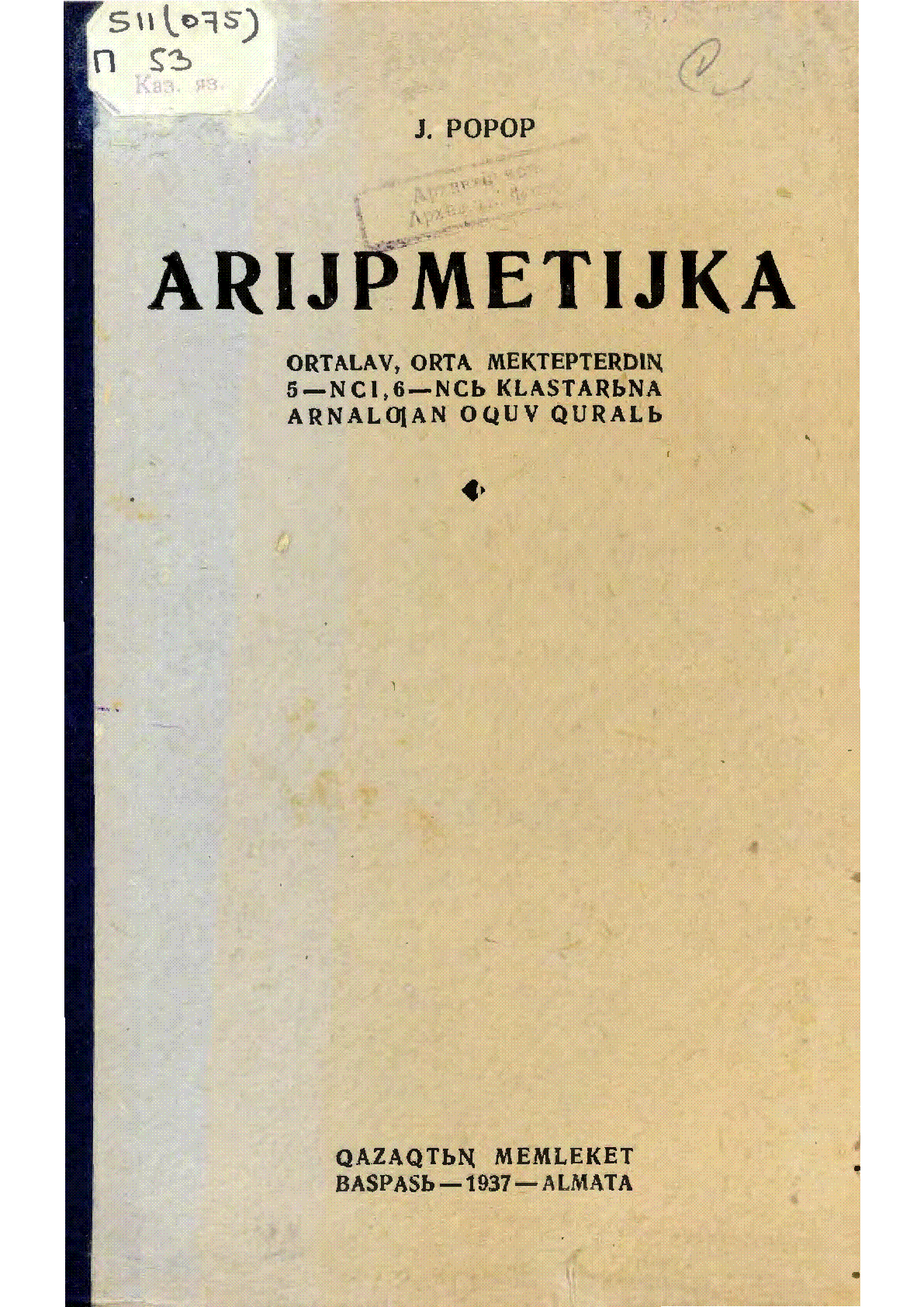 Арифметика [Мәтін] : орталау, орта мектептердің 5-6 кластарына арналған оқу құралы / И. Попов ; [жауапты ред. Бөкежанов, ауд. Сыздықов] ; Қаз. ССР оқу Халық Комиссариаты... – Алма-Ата : Қазақстан мемлекет баспасы, 1937. - 126, [1] б. - Мәтін латын қарпімен қазақ тілінде . . – 50000 дана (мұқ.) : 40 тг.