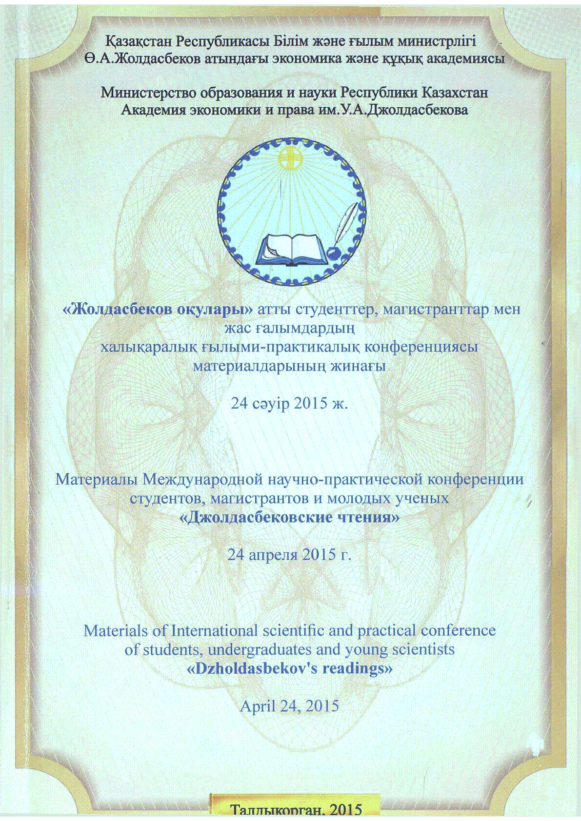 "Жолдасбеков оқулары" атты студенттер, магистранттар мен жас ғалымдардың халықаралық ғылыми-практикалық конференциясы материалдарының жинағы = Материалы международной научно-практической конференции студентов, магистрантов и молодых ученых " Джолдасбековские чтения" = Materials of International scientific and practical conference of students, undergraduates and yong scientists "Dzholdasbekov's readings" [Text] : 24 сәуір 2015 ж. / ; [жалпы ред. басқ.: Б. К. Чингаева, Р. Б. Ержанова ; ред. алқа: А. Ө. Өмірәлі [ж. б.]] ; ҚР Білім және ғылым министрлігі ; Ө. А. Жолдасбеков атын. экономика және құқық акад.... – Талдықорған : Оперативная полиграфия Алтын Баспа, 2015. - 402 б. - Мәтін қазақ, орыс және ағылш. тілд. . – Библиогр. мақала соңында . – [т. ж.] – 978-601-80216-4-10