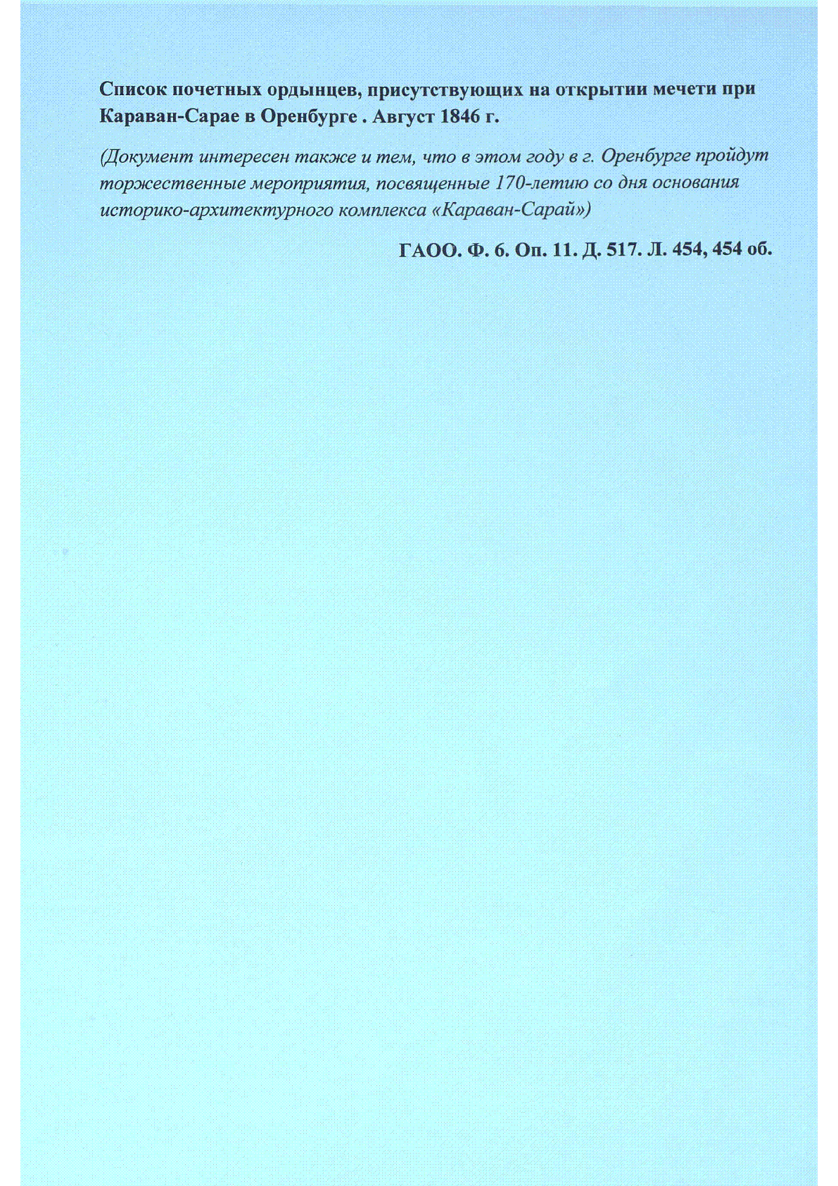 О строительстве Караван - Сарая и соборной мечети в г. Оренбурге [Text] / ; [Канцелярия Оренбургского военного губернатора] ; Гос. архив Оренбург. обл.... – Оренбург : [б. и.], 1846. - л. 454, 454 об. . .