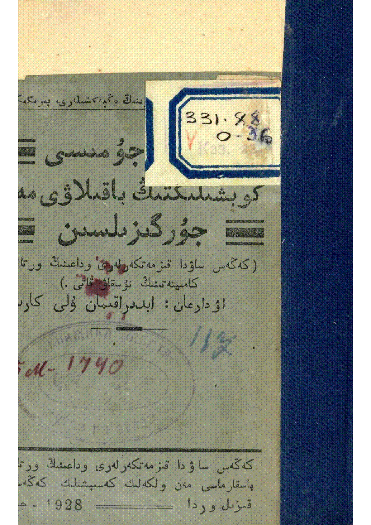 Одақ жұмысы көпшіліктің бақылауымен жүргізілсін = وداق جۇمىسى كوبشىلىكتىڭ باقىلاۋى مه ن جۇرگىزىلسىن [Мәтін] : Кеңес сауда қызметкерлері одағының орталық комитетінің нұсқау хаты / ; ауд: К. Әбдірахманұлы... – Қызылорда : Кеңес сауда қызметкерлері одағының орталық басқармасы мен өлкелік кәсіпшілік, 1928. - 62 б. - Мәтін араб графикасымен жазылған . . – 1000 дана