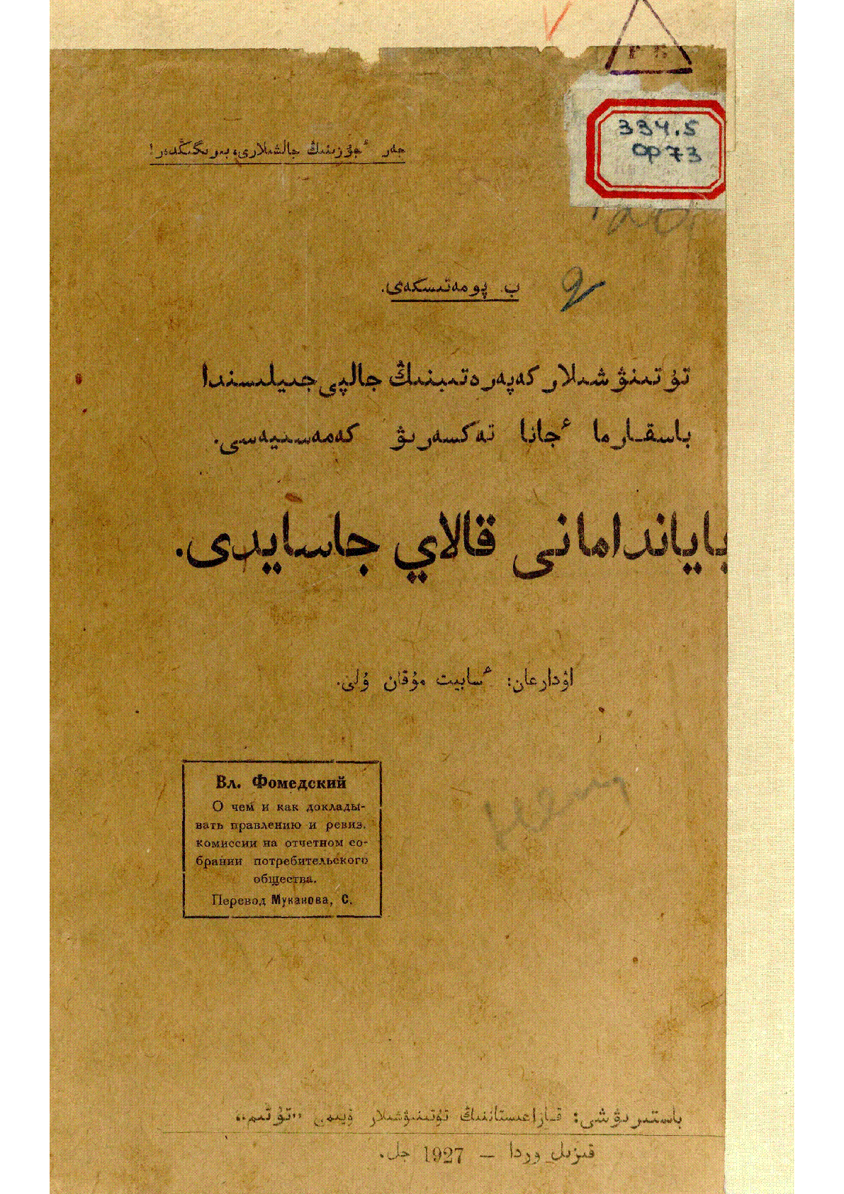 Тұтынушылар кооперативінің жалпы жиналысында басқарма және тексеру комиссиясы баяндаманы қалай жасайды [Мәтін] / В. Фомедский ; ауд. Сәбит Мұқанұлы... – Қызылорда : Қазақстан мемлекет баспасы, 1927. - 27 б. - Мәтін араб графикасымен жазылған . . – 2000 дана