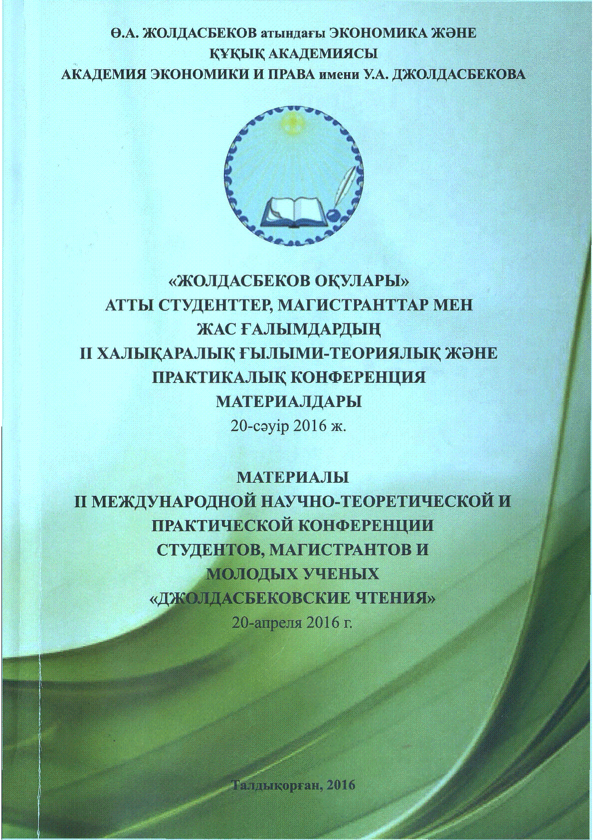 "Жолдасбеков оқулары" атты студенттер, магистранттар мен жас ғалымдардың ІІ халықаралық ғылыми-теориялық және практикалық конференция материалдары = Материалы ІІ международной научно-теоретической и практической конференции студентов, магистрантов и молодых ученых "Джолдасбековские чтения" [Мәтін] : 20-сәуір 2016 ж. / ; [жауап. ред. Р. Б. Ержаханова] ; Ө. А. Жолдасбеков атындағы экономика және құқық акад.... – Талдықорған : Оперативная полиграфия Алтын баспа, 2016. - 386 б. - Мәтін қазақ және орыс тілд. . – Библиогр. мақала соңы . – 125 дана – 978-601-275-617-3