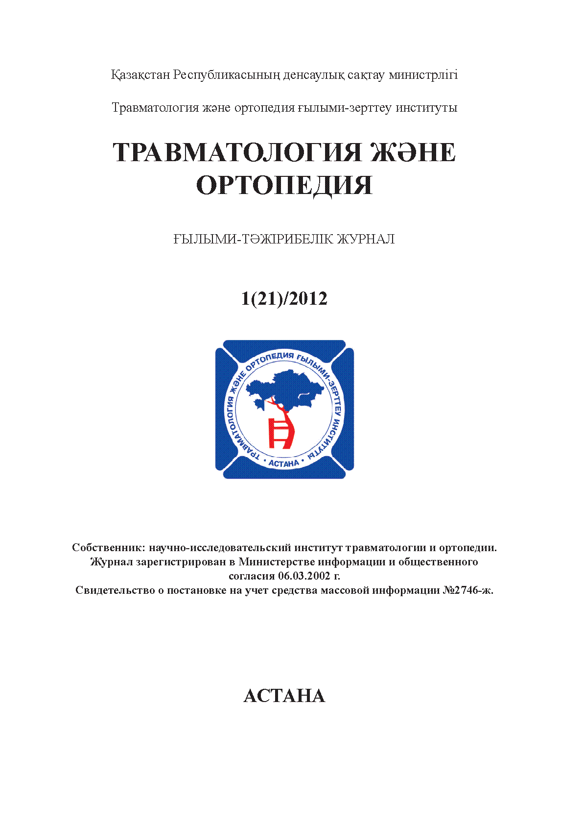 Травматология және ортопедия. - Астана, 2012. - № 1(21). - 83с. [Текст] : ғылыми-тәжірибелік журнал=научно-практический журнал / ; Қазақстан Республикасының денсаулық сақтау министрлігі Травматология және ортопедия ғылыми- зерттеу институты - Содержит материалы по современным тенденциям и технологиям в лечении повреждений и заболеваний опорно-двигательного аппарата, основанных на экспериментальных, теоретических и клинических исследованиях, проводимых в отечественных и зарубежных научно-клинических центрах. ISSN<br>