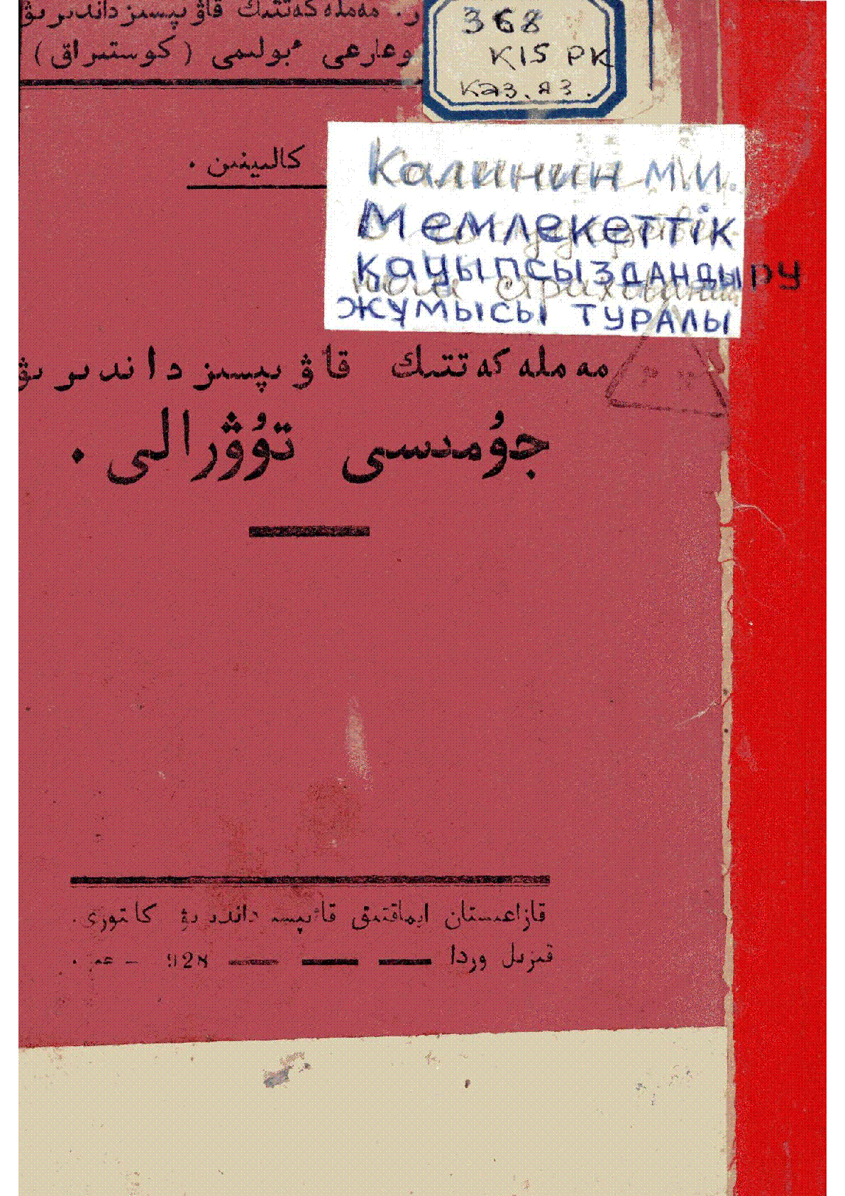 Мемлекеттік қауыпсыздандыру жұмысы туралы = مه مله كه تتىك قاۋىپسىزداندىرىۋ ءجۇمىسى تۇۋرالى [Мәтін] / М. И. Калинин ... – Қызылорда : Қазақ мемлекет баспасы, 1928. - 30 б. - Мәтін араб графикасымен жазылған . . – 10000 дана