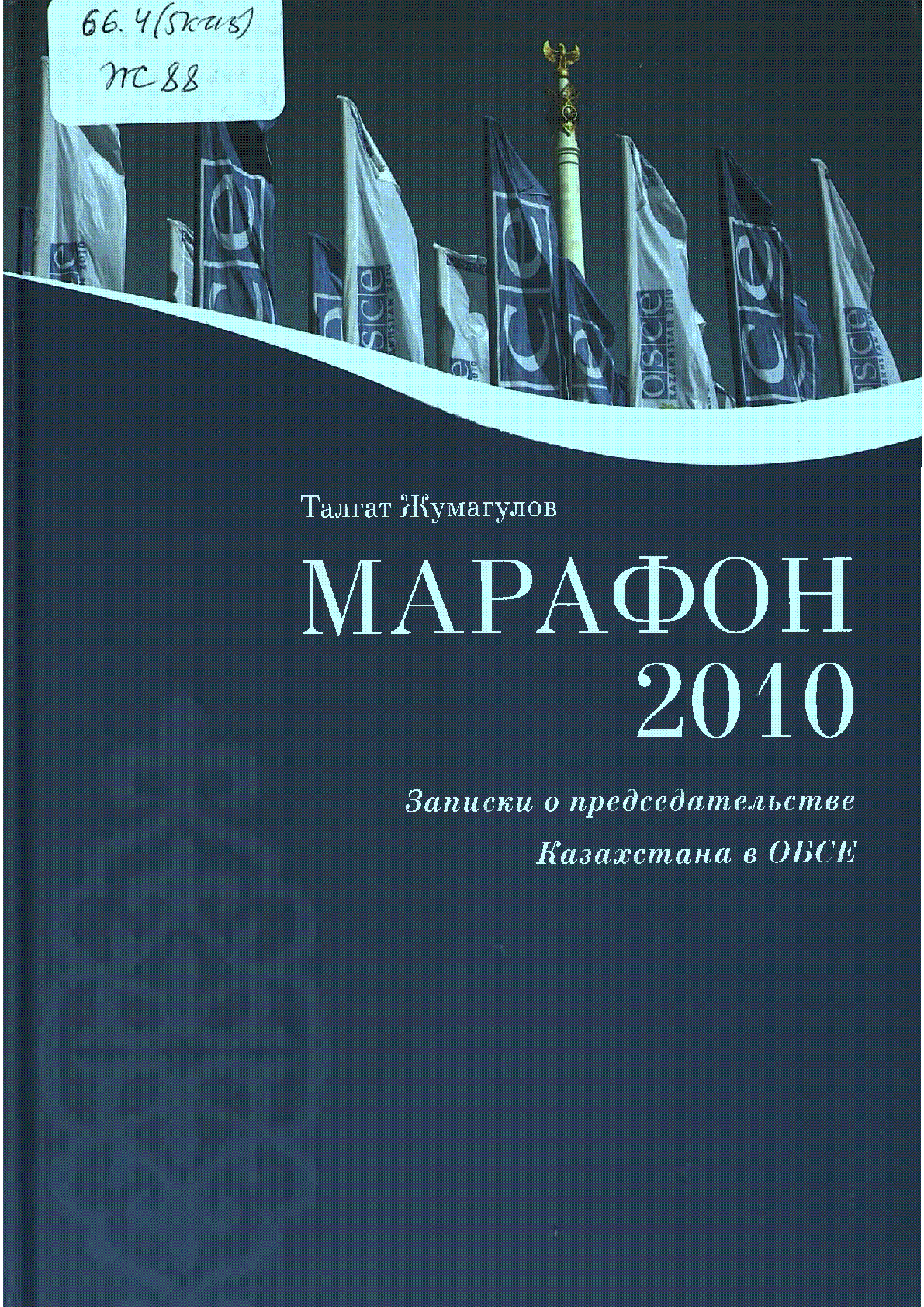Марафон-2010 [Текст] : Записки о председательстве Казахстана в ОБСЕ / Т. М. Жумагулов ; ИМЭП при фонде Первого Президента РК - Лидера нации... – Астана : Алматы : ИМЭП при фонде Первого Президента, 2016. - 316 с. . – Библиогр. в сносках . – 500 экз. – 978-601-7079-41-3 (в пер.) : 40 тг.