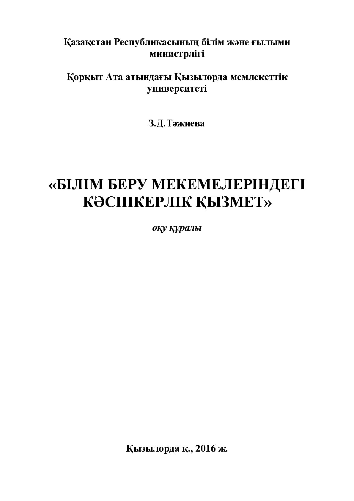 Білім беру мекемелеріндегі кәсіпкерлік қызмет [Мәтін] : оқу құралы / З. Д. Тәжиева ; ҚР Білім мен ғылым министрлігі, Қорқыт Ата атын. Қызылорда мем. ун-ті... – Қызылорда : [б. ж.], 2016. - 134 б. . – Библиогр.: 132-134 б. . – [т. ж.] – 978-601-278-820-4