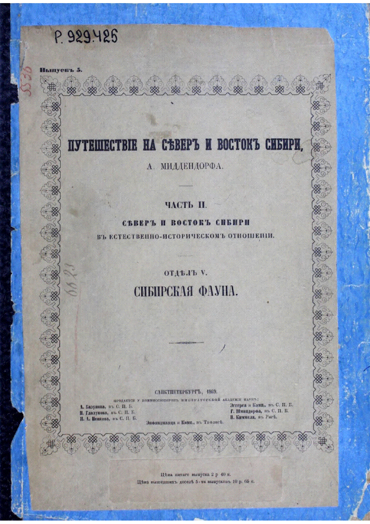 Путешествие на Север и Восток Сибири [Текст] : Север и Восток Сибири в естественно-историческом отношении / А. Ф. Миддендорф- Санкт-Петербург : [б. и.] , 1869.– [б. т.] . - Книга на старославянском языке . Ч. 2, отд. 5, вып. 5 . Сибирская фауна– 310 с., ил. .