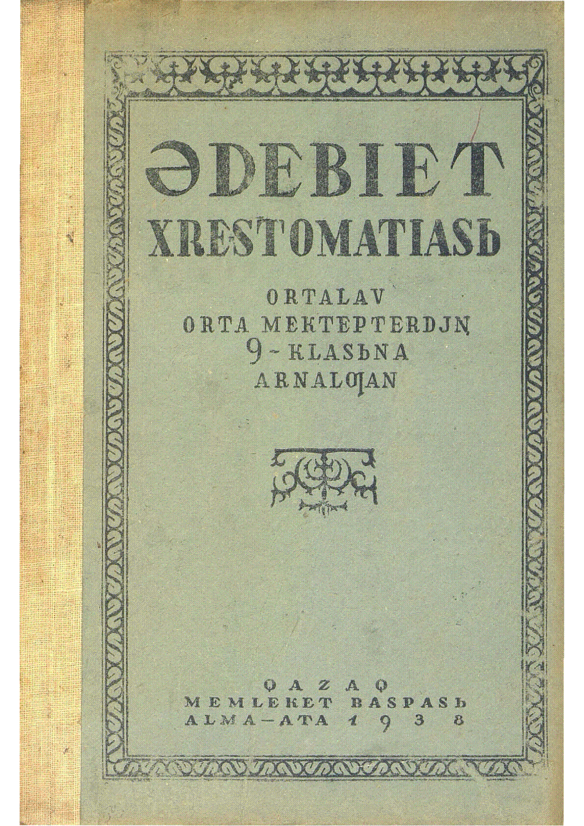 Әдебиет хрестоматиясы [Мәтін] : орта мектептің 9-класына арналған / Е. Смайылов Қ. Бекхожин ; [жауапты ред. Ә. Сарсембаев] ; Қаз. ССР оқу Халық Комиссариаты... – Алма-Ата : Қазақ мемлекет баспасы, 1938. - 181, [1] б. - Мәтіні латын қарпімен қазақ тілінде . . – 5150 дана (мұқ.) : 80 тг.