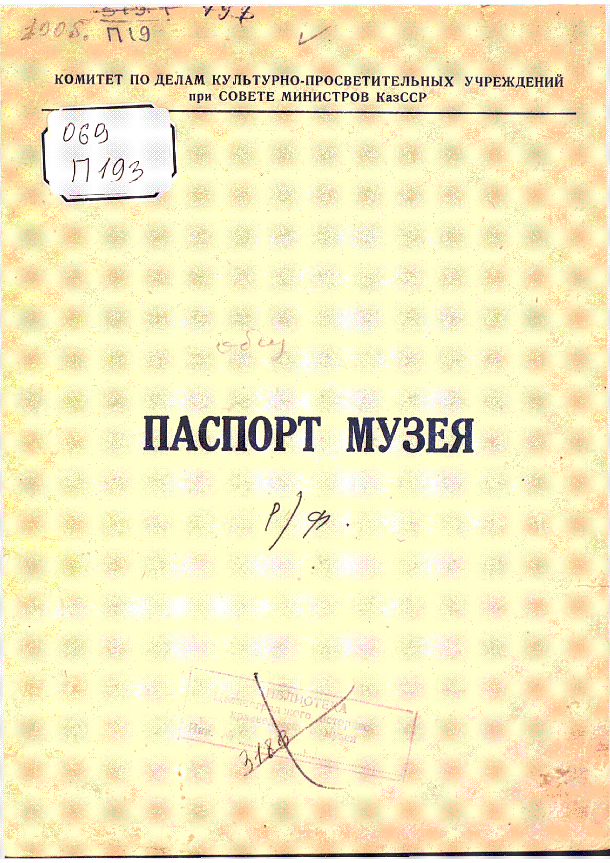 Паспорт музея [Текст] / ; Ком. по делам культ.-просвет. учреждений при Совете Министров КазССР... – [Алма-Ата] : Гостипография № 3, [195-?]. - 16 с. . . – 300 экз. : 10 тг.