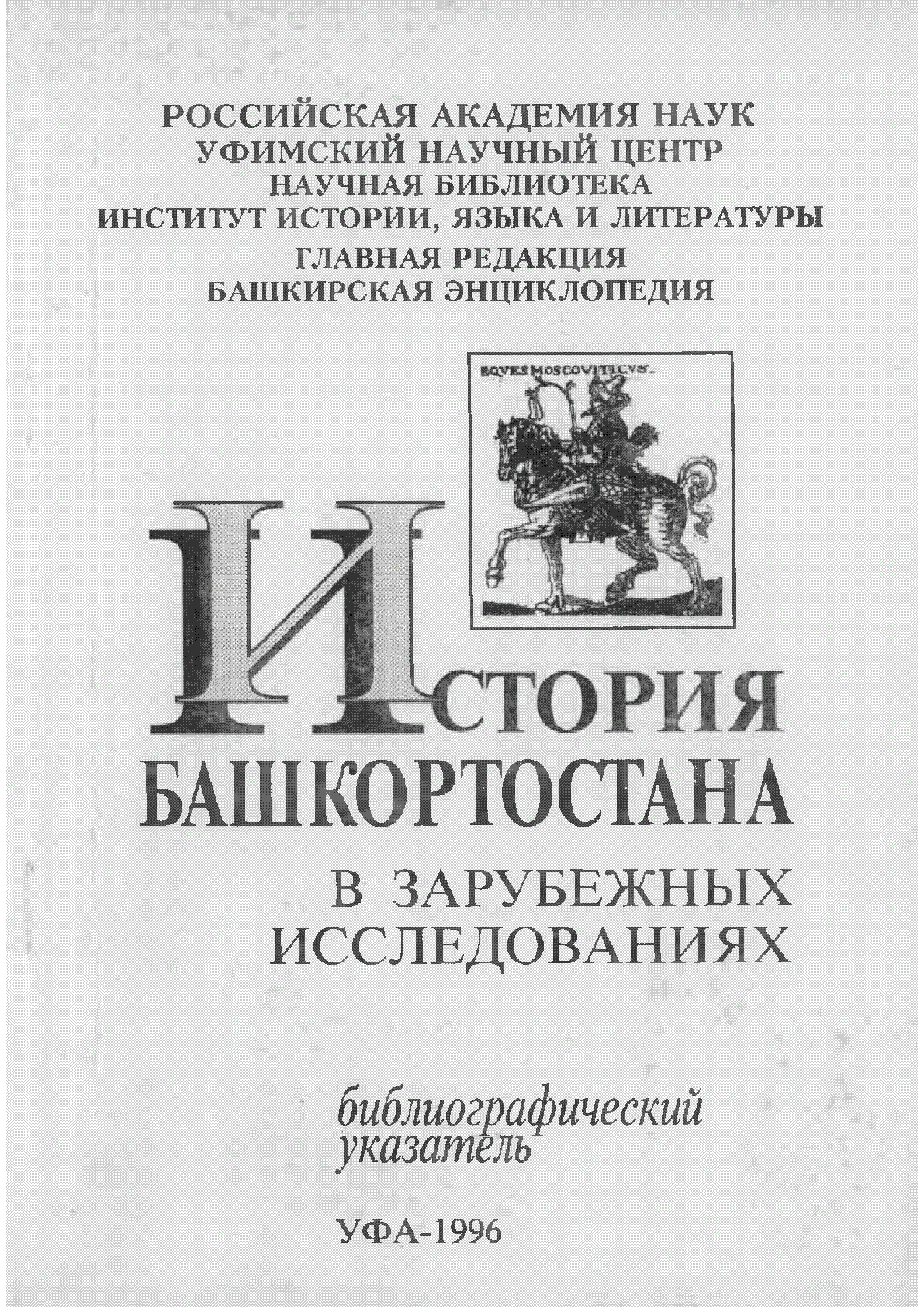История Башкортостана в зарубежных исследованиях = Башкортостан тарихы сит ил тикшеренеүзәренде [Текст] : библиографический указатель / ; [ответ. за вып. Ю. М. Абсалямов; сост.: Л. В. Сатаева, А. Г. Салихов; ред.: Л. В. Сатаева, Ш. В. Нафиков; науч. ред. Г. Т. Хусаинова]; Рос. акад. наук ; Уфимский науч. центр ; Научная библиотека ; Ин-т истории, языка и литературы ; Гл. ред. Башкирская энциклопедия... – Уфа : [б. и.], 1996. - 96 с. . – Имен. указ.: с. 87-95 . – 400 экз. – 5-201-13825-Х