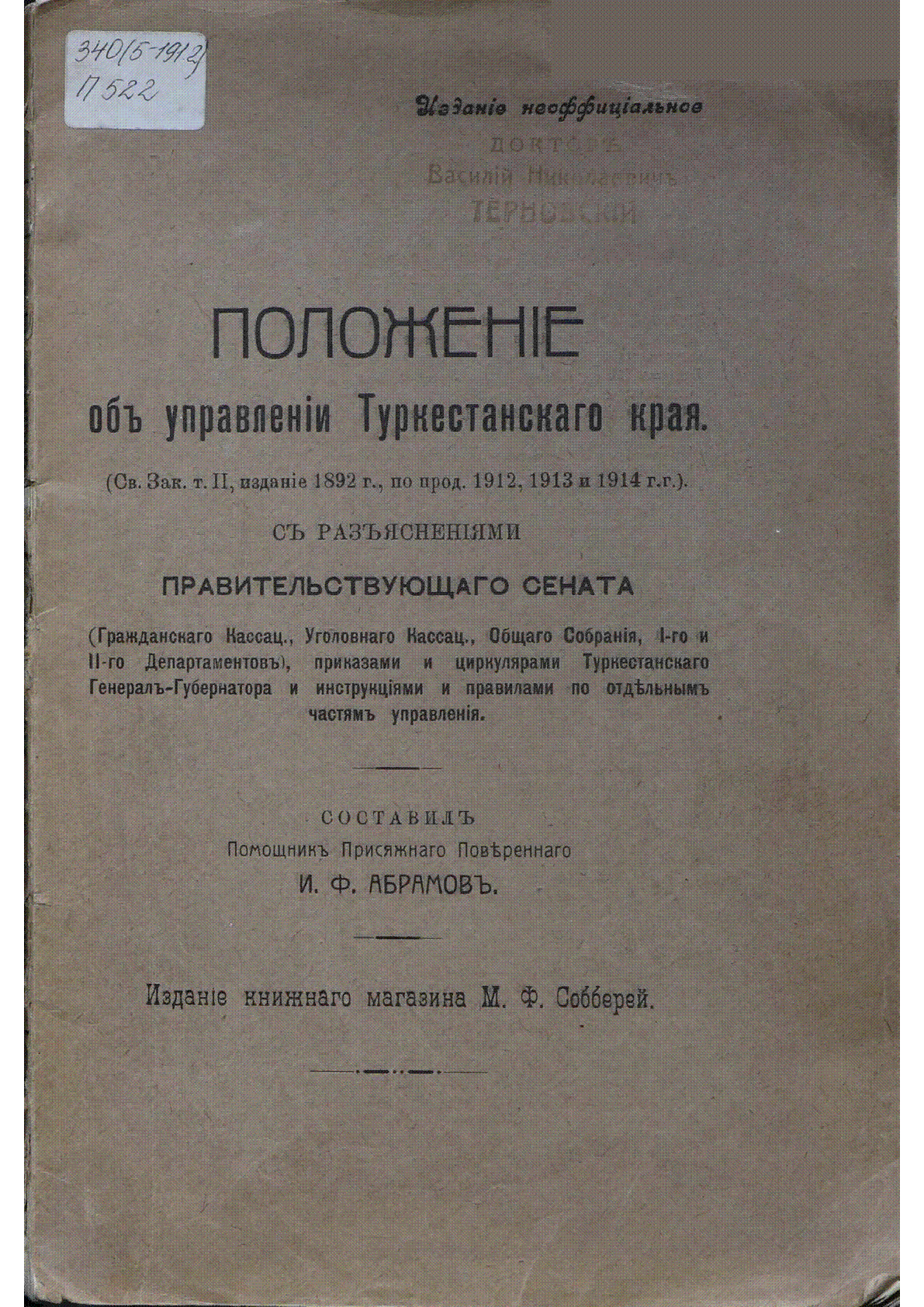 Положение об управлении Туркестанского края [Текст] : (св. зак. т. 2, издание 1892 г., по прод. 1912, 1913 и 1914 гг.) : с разъяснениями Правительствующего сената (Граджданского Кассац., Уголовного Кассац., Общего Собрания, 1-го и 2-го Департаментов, приказами и циркулярами Туркестанского Генерал-Губернатора и инструкциями и правилами по отдельным частям управления) / ; сост. И. Ф. Абрамов... – Ташкент : Изд. кн. магазина М. Ф. Собберей, 1916. - XXI, 250 с. - Текст на старорус. яз. . – Предм. указ.: с. V-XiX . – [б. т.] : 50 тг.