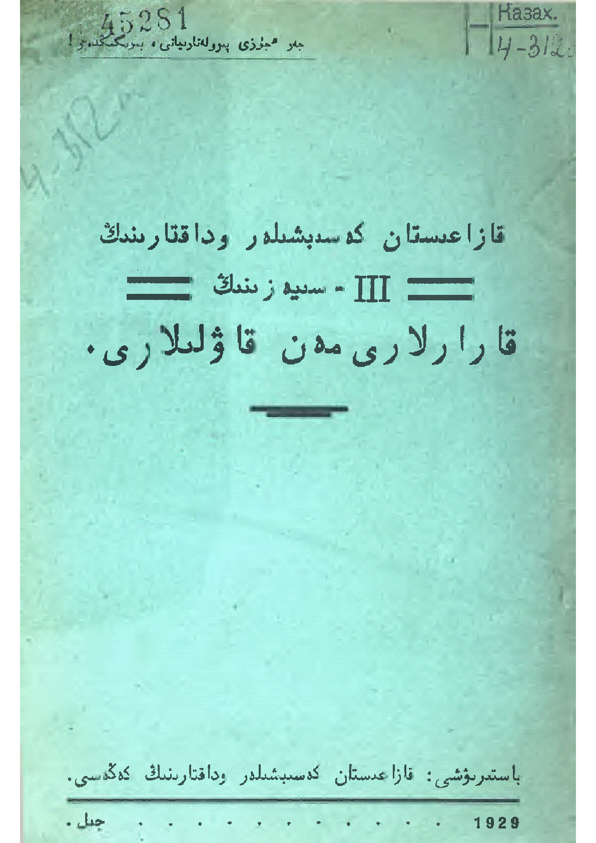 Қазақстан кәсіпшілер одақтарының ІІІ - съезінің қарарлары мен қаулылары = قازاعىستان كه سىبشىله ر وداقتارىنىك 3-سىيه زىنىك قارارلارى مه ن قاولىلارى [Мәтін] / ... – Қызыл Орда : Қазақстан кәсіпшілер одақтарының кеңесі, 1929. - 112 б. - Мәтіні араб қарпімен қазақ тілінде . . – 1500 дана : 20 тг.