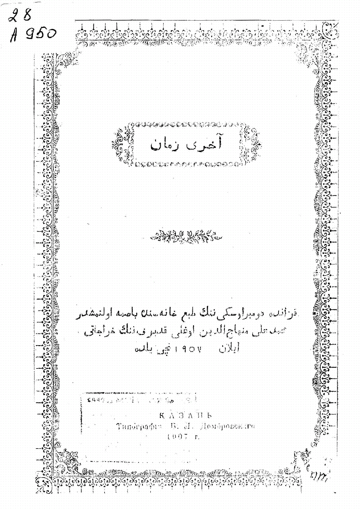 Ахир заман = اخر زمان [Text] / ... – Казань : Тип. Б. Л. Домбровского, 1907. - 16 с. - Текст на татарском языке в арабской графике . . – [б. т.] : 10 тг.