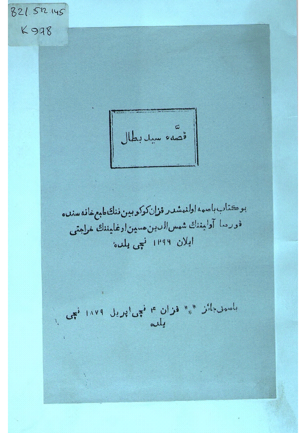 Кыссы Саид Баттал = قصهء سيد بطال [Text] / ; ред. Ш. Хусейнов... – Казань : Типо-литография Императорского Университета, 1879. - 39 с. - Текст на татарском яз. в арабской графике . . – [б. т.] : 20 тг.