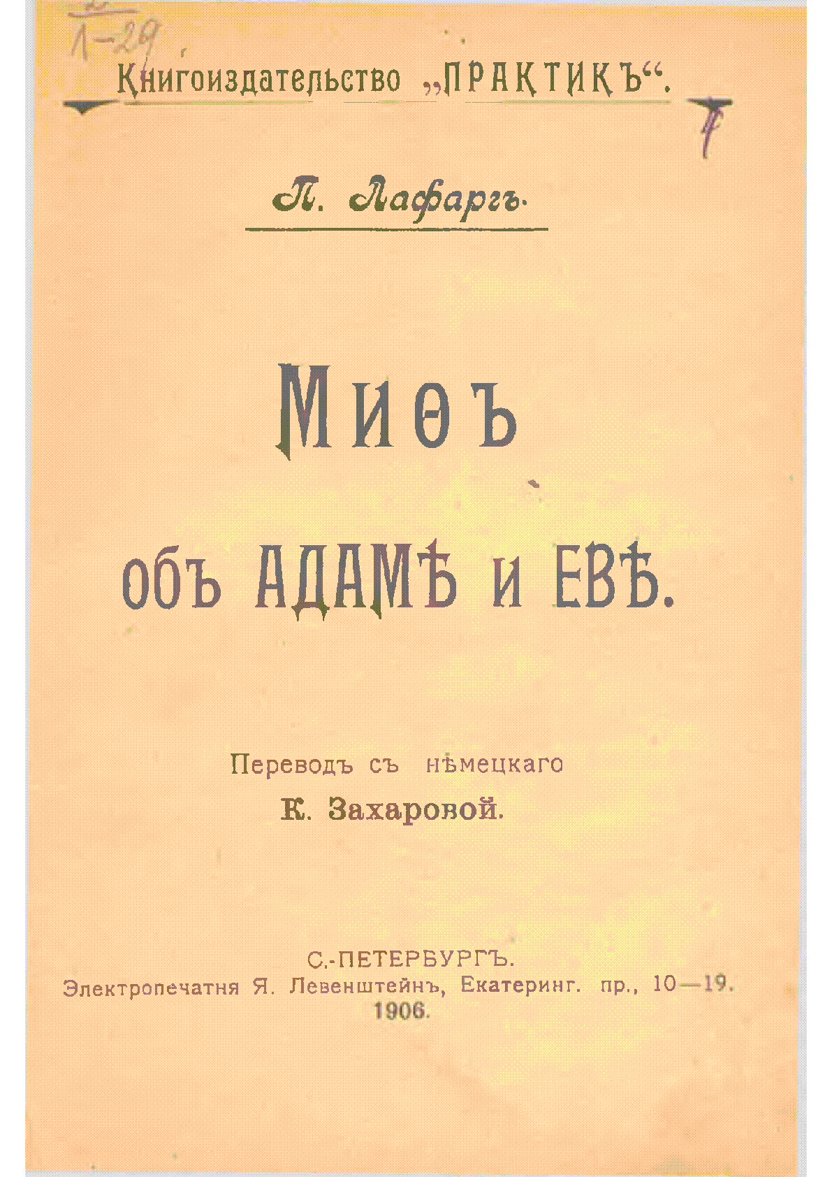 Миф об Адаме и Еве [Текст] / П. Лафарг ; пер. с нем. К. Захаровой... – Санкт-Петербург : Практик, 1906. - 29, [1] с. . – Библиогр. в подстроч. примеч. . – [б. т.]