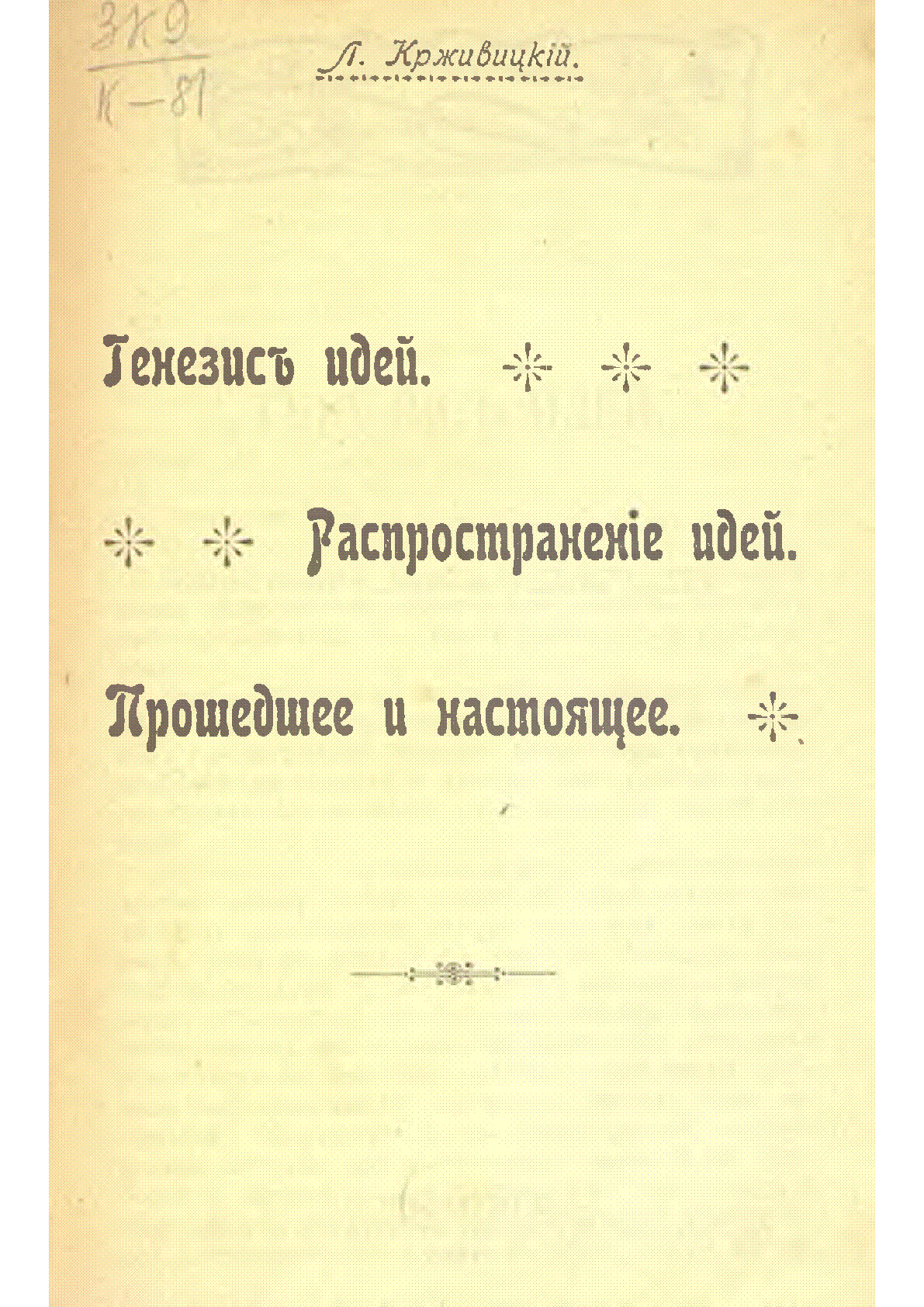 Генезис идей. Распространение идей. Прошедшее и настоящее [Текст] / Л. Кршивицкий ... – Санкт-Петербург : Типо-лит. "Евг. Тиле преемн.", 1905. - 79 с. . . – [б. т.]