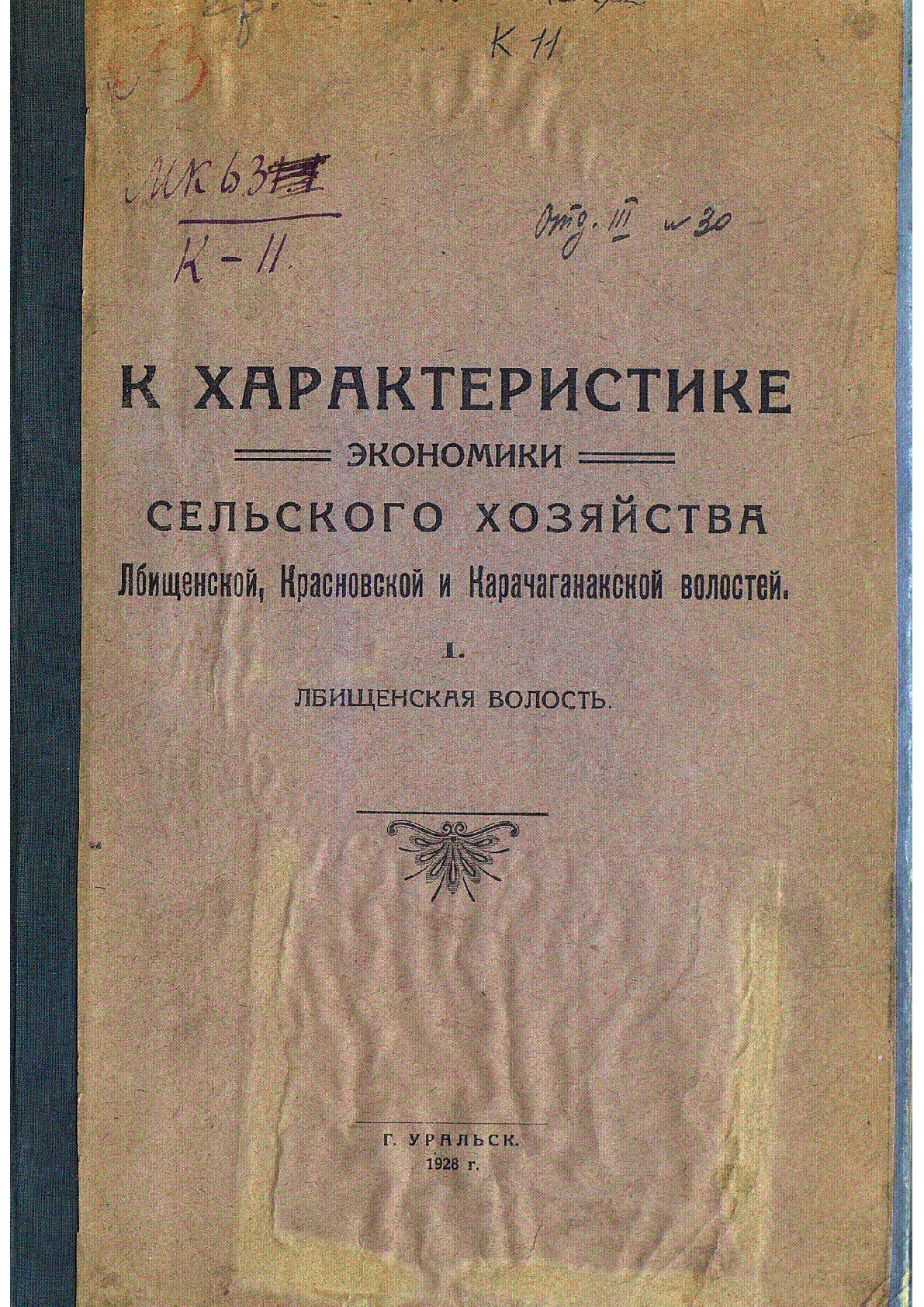 К характеристике экономики сельского хозяйства Лбищенской, Красновской и Карачаганакской волостей [Текст] / Н. Перепечко- Уральск : Гостип. им. т. Луначарского , 1928.– 50 экз. . Библиогр. в подстроч. примеч. Т. 1 . Лбищенская волость– 17 c.