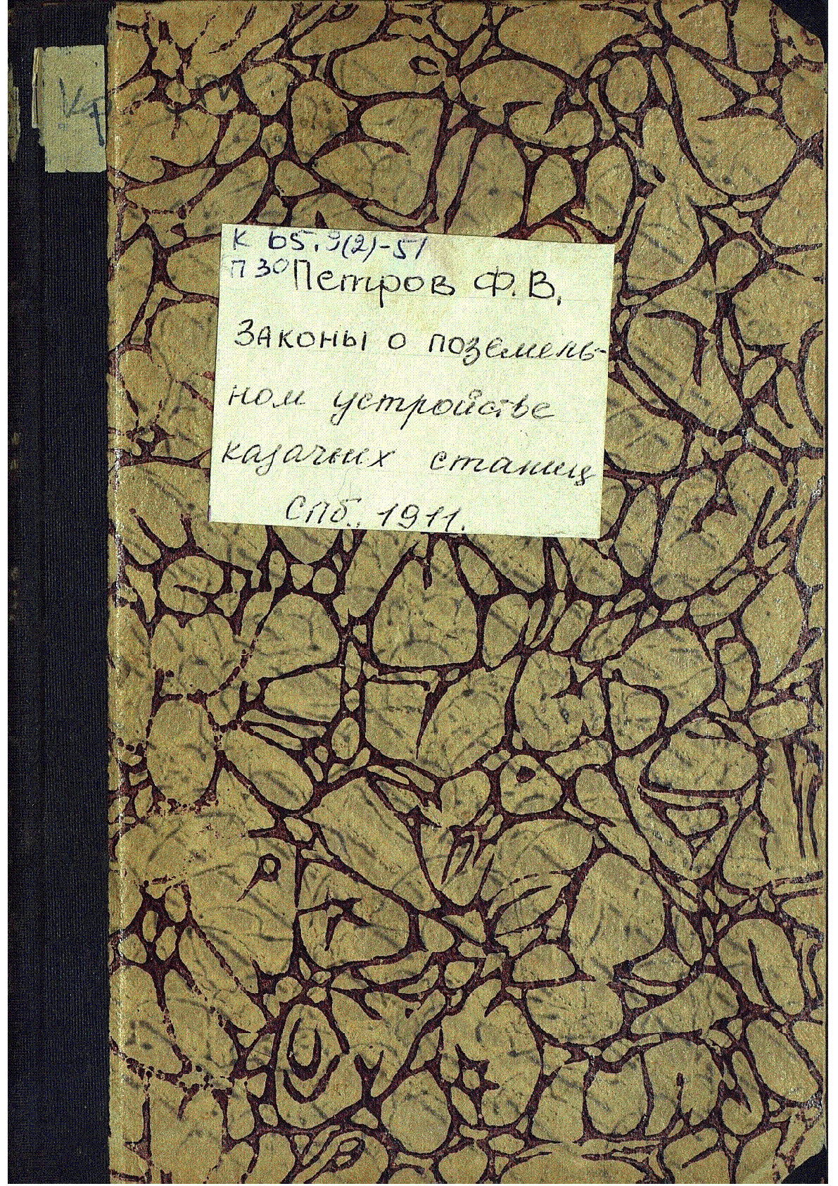 Законы о поземельном устройстве казачьих станиц [Текст] : сборник действующих по 1 августа 1911 г., узаконений о поземельном устройстве казачьих станиц и проживающих в казачьих поселениях лиц невойскового сословия, с разъяснениями текста закона Правительствующим Сенатом и Военным Советом / В. Ф. Петров . – 2-е изд. ., испр. и доп.. – Санкт-Петербург : Санкт-Петербургская губернская типография, 1911. - 168 с. . – Библиогр. в подстроч. примечании . – [б. т.]