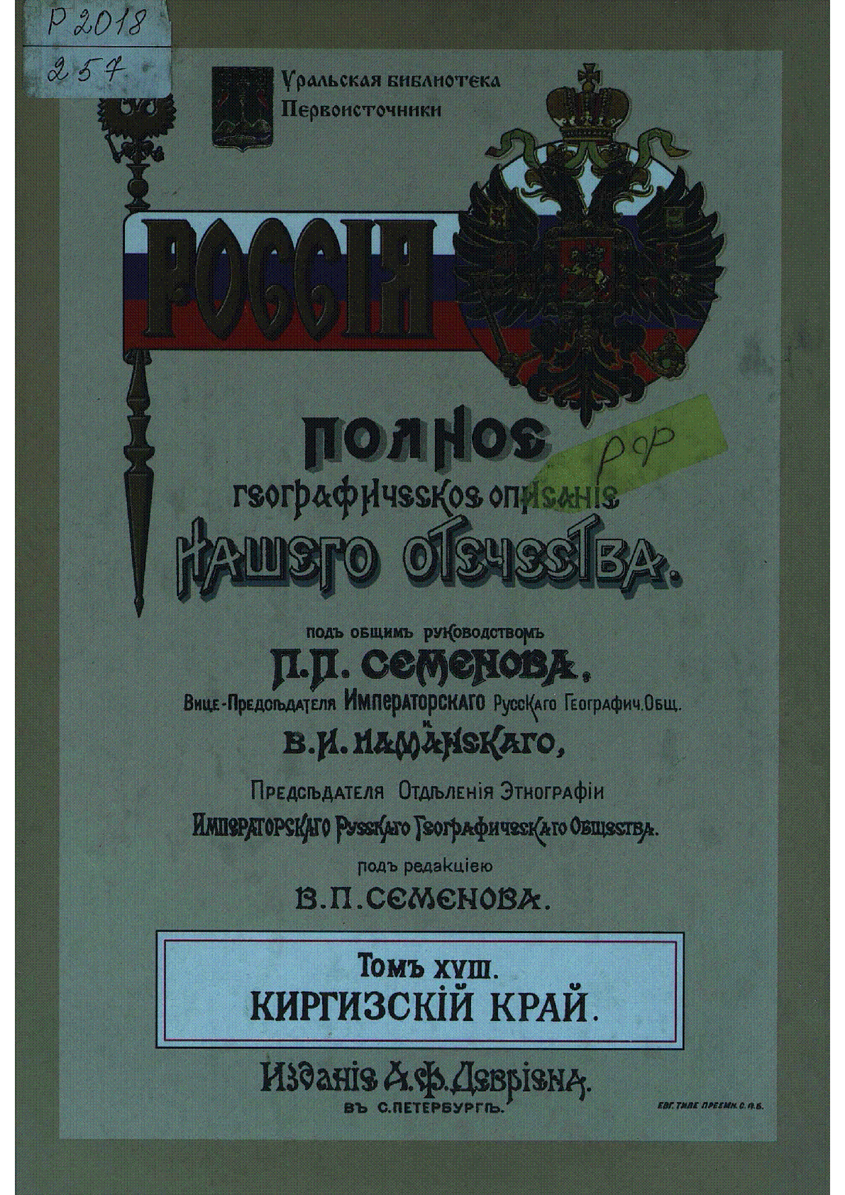 Россия. Полное географическое описание нашего Отечества [Текст] ; [под редакцией В. П. Семенова ; под общим руководством П. П. Семенова, В. И. Ламанского] . – [Репринтное издание] ,- Уральск : Оптима , 2006. – Серия "Уральская библиотека". Первоисточники.– 500 экз. . – ISBN 9965-9938-4-Х (в пер.) - Дополнение титульного листа оригинала : Россия. Полное географическое описание нашего Отечества. Настольная и дорожная книга для русских людей, Т. 18. Киргизский край. - Санкт-Петербург: А. Ф. Девриен, 1903. - Мырзатай Жолдасбеков қоры . Указатель главных источников и пособий по Киргизскому краю: с. 436-453, Указатель, имена географические: с. 453-469, Указатель, имена личные: с. 470-478 Т. 18 . Киргизский край– 478, [5] с., ил. . (в пер.) : 200 тг.