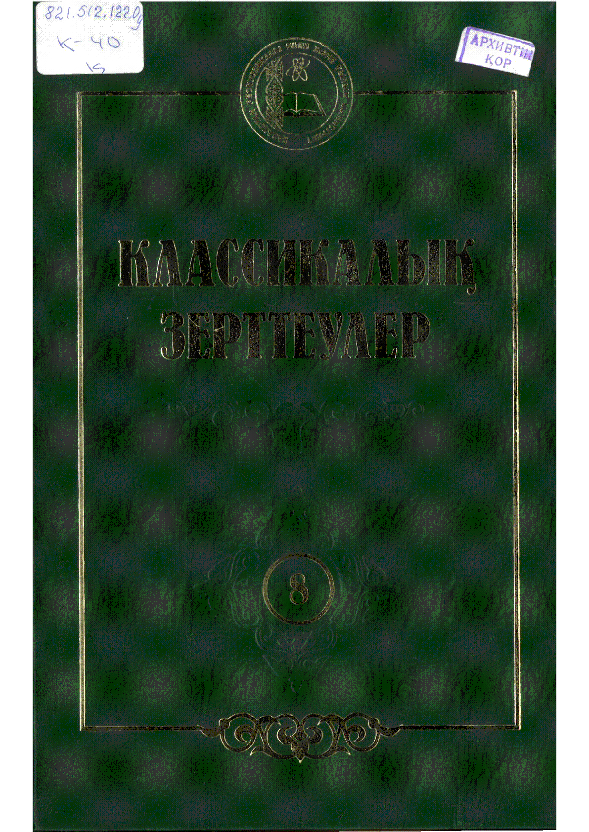 Классикалық зерттеулер [Мәтін] : көп томдық ; Қазақстан Республикасы Білім және ғылым министрлігі ; М. О. Әуезов атындағы Әдебиет және өнер институты ; жауапты редактор А. О. Мұқан ; құрастырушылар : А.С.Еркебай [және т. б.] .- Алматы : Әдебиет әлемі , 2012. – Классикалық зерттеулер.– 1000 дана . – ISBN 978-601-7414-08-5 (8-том), ISBN 978-601-7414-00-9 (мұқ.) - Қазақстан Республикасы Білім және ғылым министрлігі "Ғылыми қазына" мақсатты бағдарламасы. - Мәтін қазақ, орыс тілдерінде. - Мырзатай Жолдасбеков қоры . Пайдаланған әдебиеттер: 366 б. 8-том . Қазақ театртану ғылымы (қалыптасу кезеңі)– 376 б. (мұқ.) : 1500 тг.
