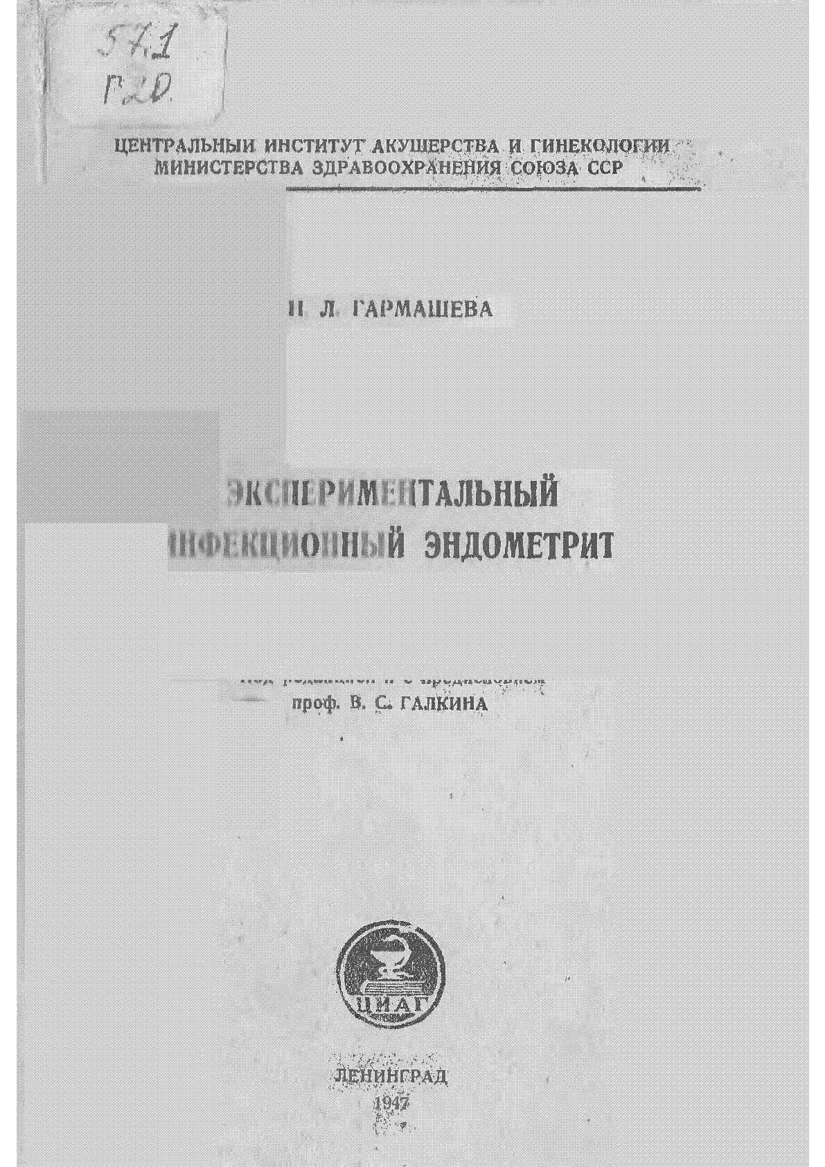 Экспериментальный инфекционный эндометрит [Текст] / Н. Л. Гармашева ; под ред. В. С. Галкина ; Центр. ин-т акушерства и гинекологии м-ва здравоохранения СССР... – Ленинград : Тип. им. Котлякова, 1947. - 168, [4] с. . – Библиогр.: с. 159-169 . – 3000 экз.