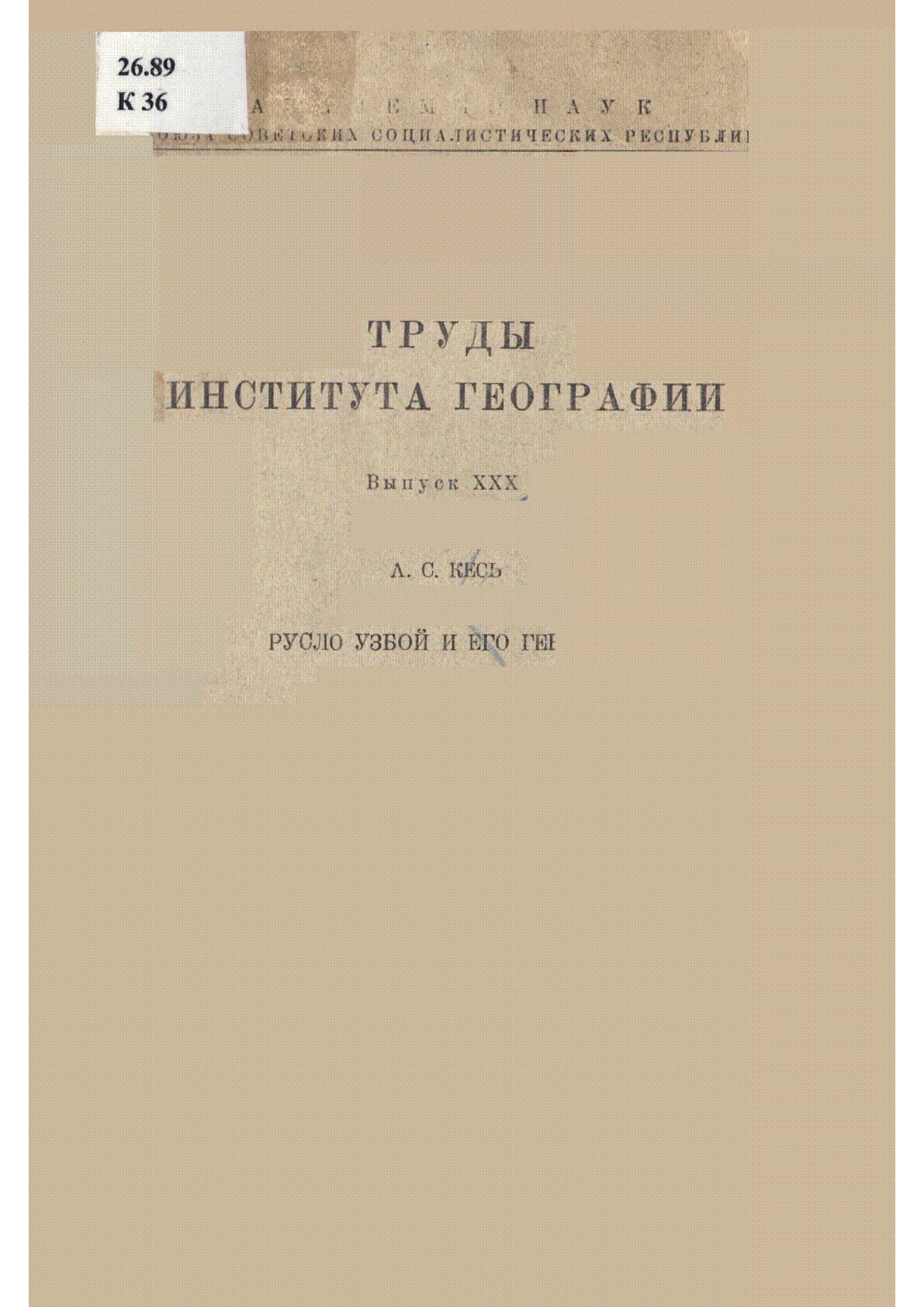 Труды института географии [Текст] / А. С. Кесь ; Академия наук СССР .- Москва ; Ленинград : Акад. наук СССР , 1939.– [б. т.] . Библиогр.: с. 114-117 вып. 30 . Русло Узбой и его генезис– 120 с., ил., карт., черт. .