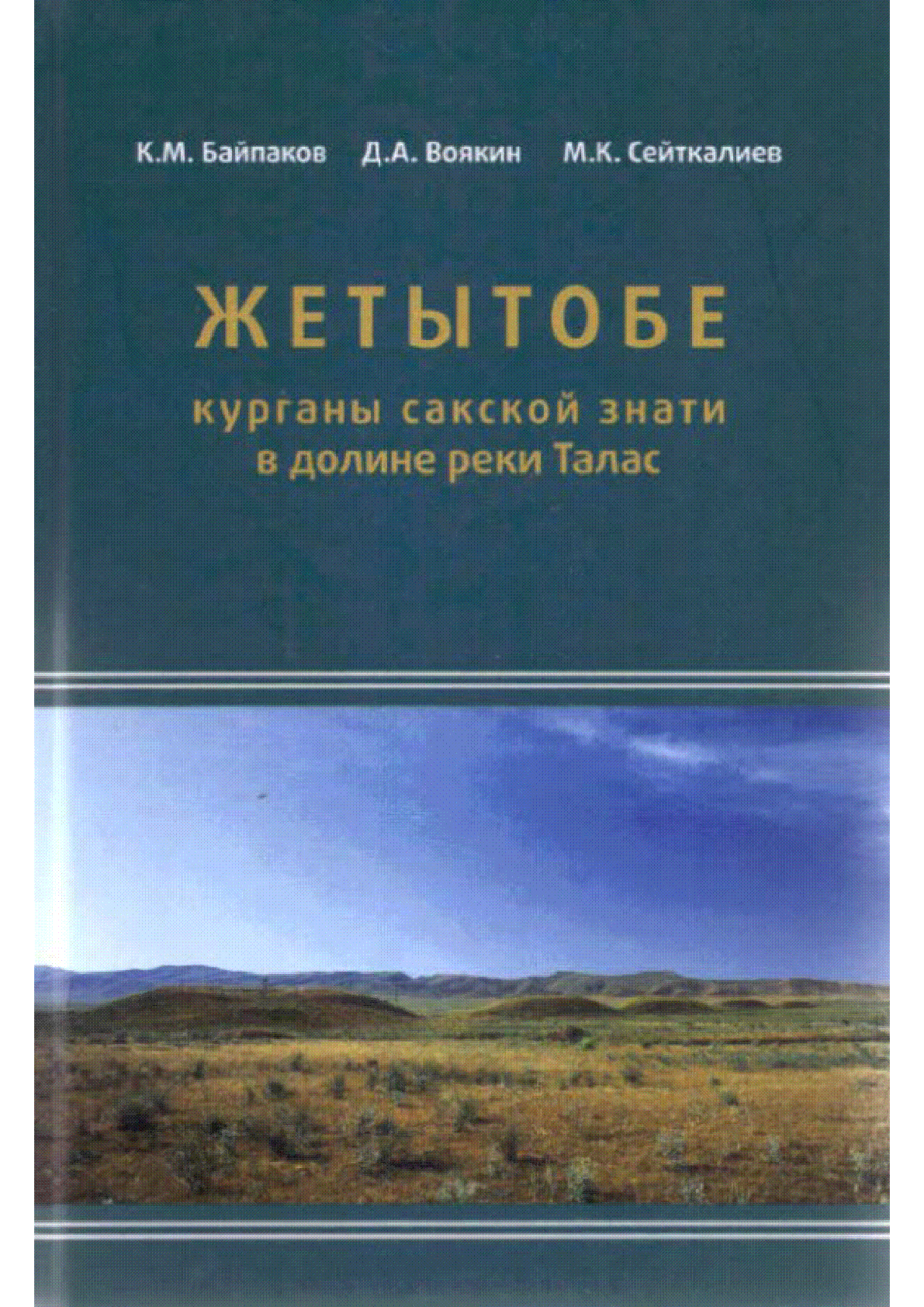 Жетытобе: Курганы сакской знати в долине реки Талас [Текст] / К. М. Байпаков Д. А. Воякин М. К. Сейткалиев ; ТОО "Археологическая экспертиза"... – Алматы : Қазақ энциклопедиясы, 2019. - 183 с., ил.; - Выпущена по программе "Повышение конкурентоспособности сферы культуры и искусства, сохранение, изучение и популяризация казахстанского культурного наследия и повышение эффективности реализации архивного дела", по подпрограмме "Приобретение, издание и распространение социально-важных видов литературы" Комитета языковой политики Министерства культуры и спорта Республики Казахстан . – Библиогр.: с. 140-146 . – 5000+150 экз. – 978-601-7967-12-3 (в пер.) : 607,84 тг.