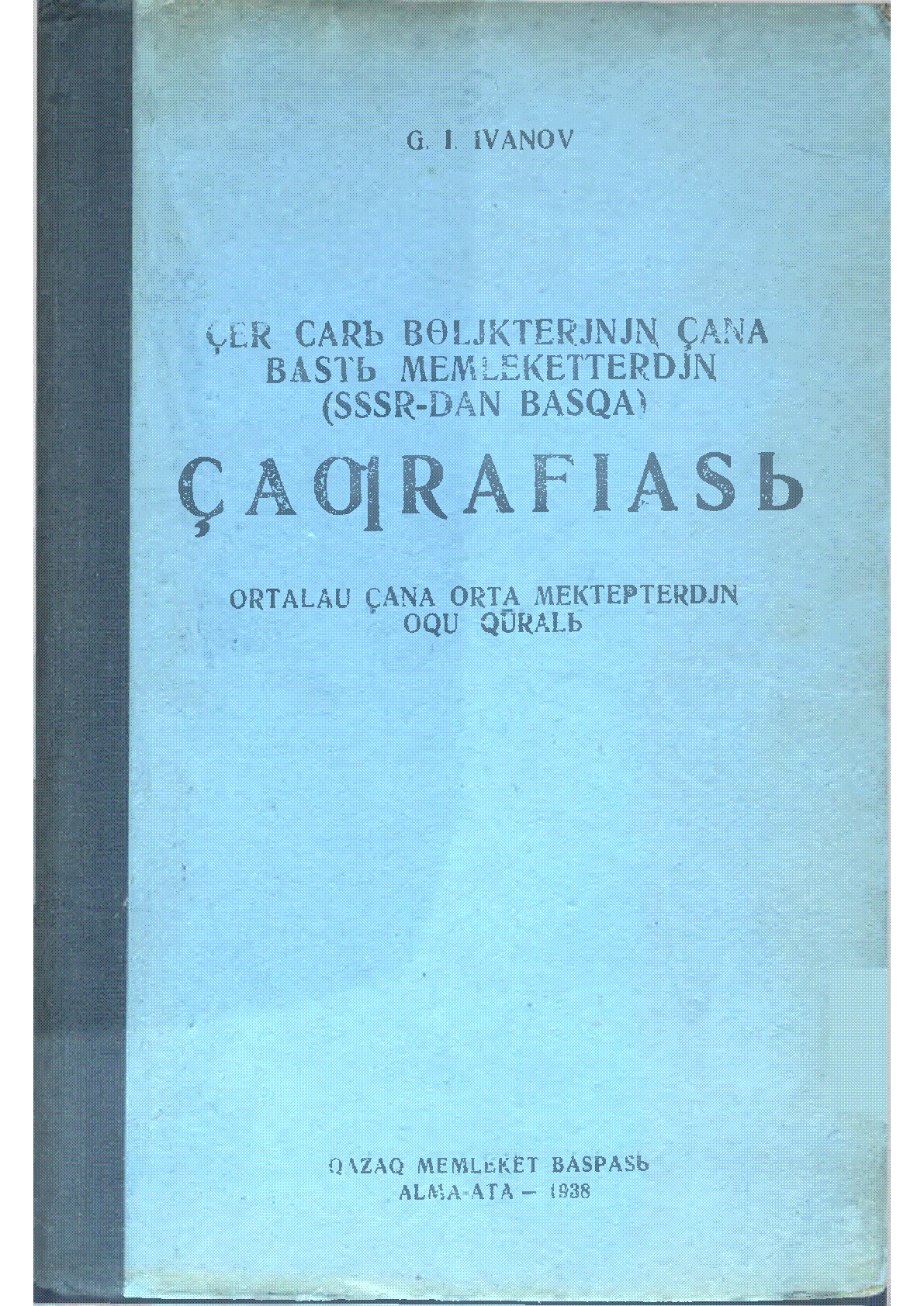 Жер шары бөліктерінің және басты мемлекеттердің (СССР-ден басқа) географиясы [Мәтін] : орталау және орта мектептердің 6-класына арналған / Г. И. иванов ; [жауапты ред.: Е. Бекмуханов, С. Қодаров] ; Қазақ ССР Оқу Халық Комиссариаты... – Алма-Ата : Қазақ мемлекет баспасы, 1938. - 239, [1] б., суретті; - Мәтін латын қарпімен қазақ тілінде . . – 29150 дана (мұқ.) : 40 тг.
