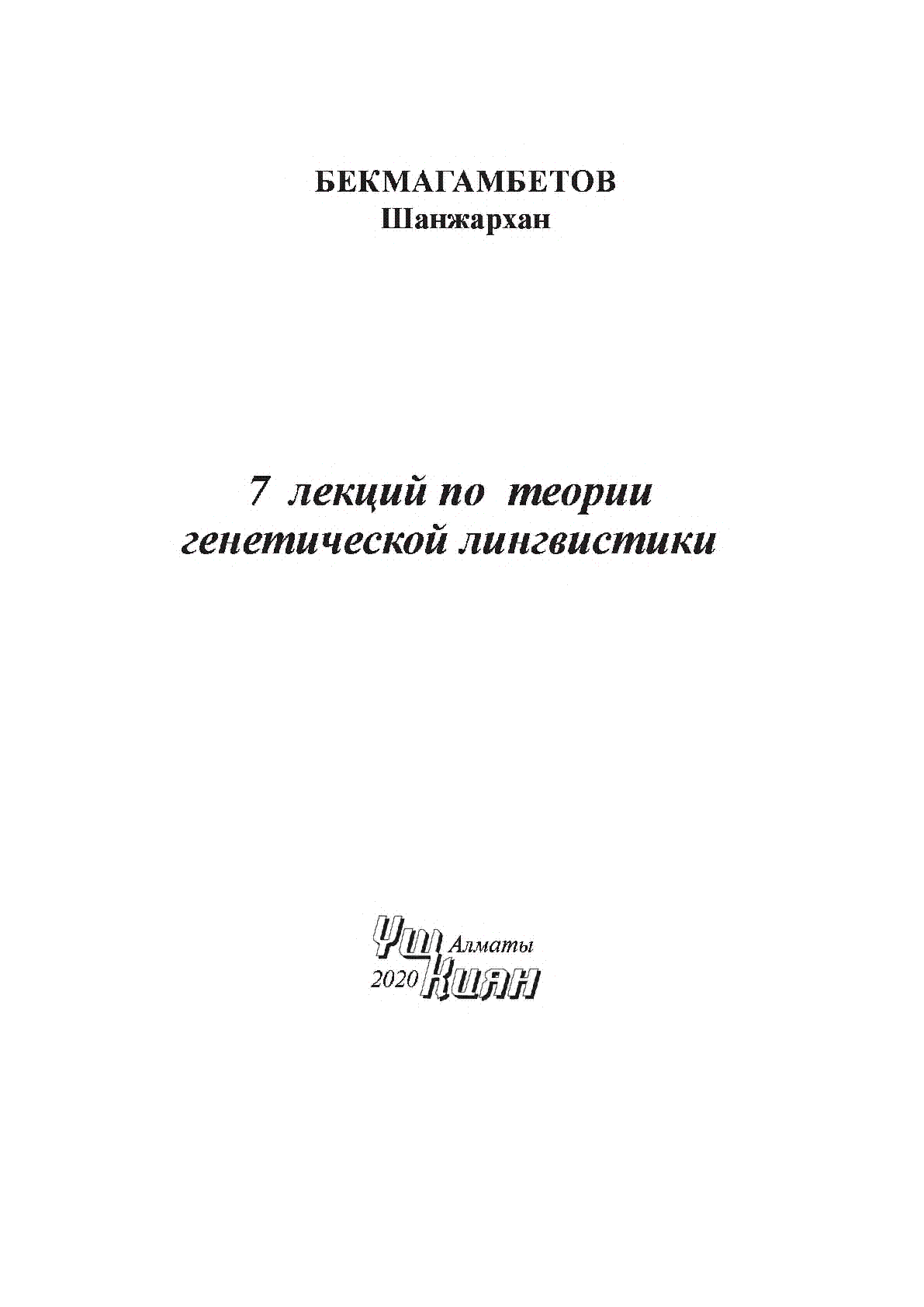 7 лекций по теории генетической лингвистики [Текст] / Ш. Бекмагамбетов ; [авторизованный пер. с каз. Р. Кулжан]... – Алматы : Үш Қиян, 2020. - 127 с. . . – 500 экз. – 9965-601-80803-9-5