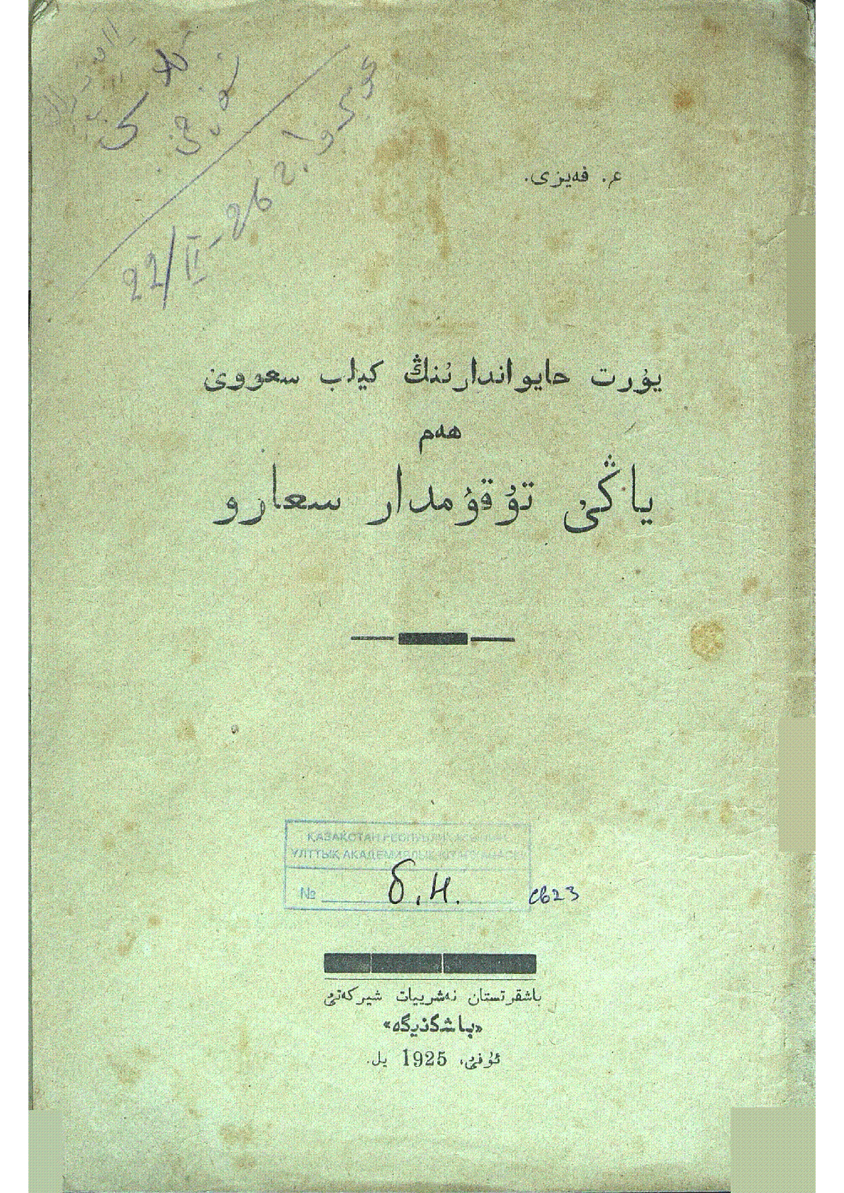 Происхождение домашних животных [Text] / Г. Файзий ... – Уфа : [б. и.], 1925. - 48 с., ил.; - текст на башкирском языке арабской вязью . . – 2000 экз. : 20 тг.