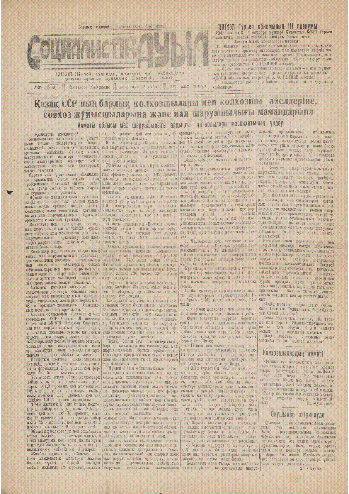 Социалистік ауыл [Мәтін]. .– 1100 дана. 1949. - 22 октябрь. - №39 (1209). - 1100 дана