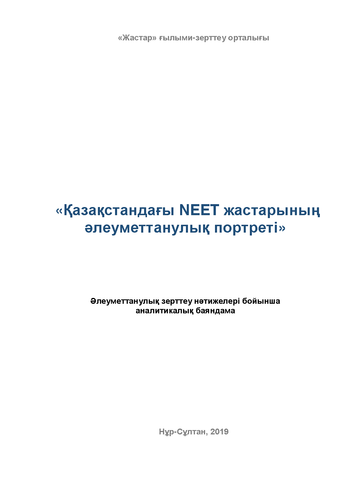 Қазақстандағы NEET жастарының әлеуметтанулық портреті [Мәтін] : әлеуметтанулық зерттеу нәтижелері бойынша аналитикалық баяндама / ; «Жастар» ғыл.-зерт. орталығы... – Нұр-Сұлтан : [б. ж.], 2019. - 188 б., суретті; - Мәтін қаз., орыс тілд. . . – [т. ж.]
