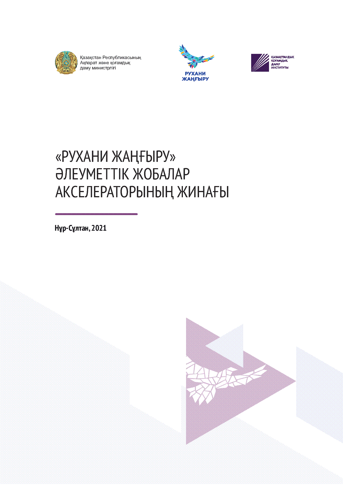 "Рухани жаңғыру" әлеуметтік жобалар акселераторының жинағы = Сборник социальных проектов акселератора «Рухани жаңғыру» [Мәтін] / ; [құраст.: Л. Г. Бурлаченко [ж. б.] ; жалпы ред. Ж. Қ. Боқанова] ; ҚР Ақпарат және қоғамдық даму министрлігі ; «Рухани жаңғыру» қазақстандық қоғамдық даму ин-ты... – Нұр-Сұлтан : [б. ж.], 2021. - 60 б.+ . - "Кемел болашақ" жобасы аясында әзірленген. - Рухани жаңғыру. - Мәтін қазақ, орыс тілд. . . – [т. ж.] : 0 тг.