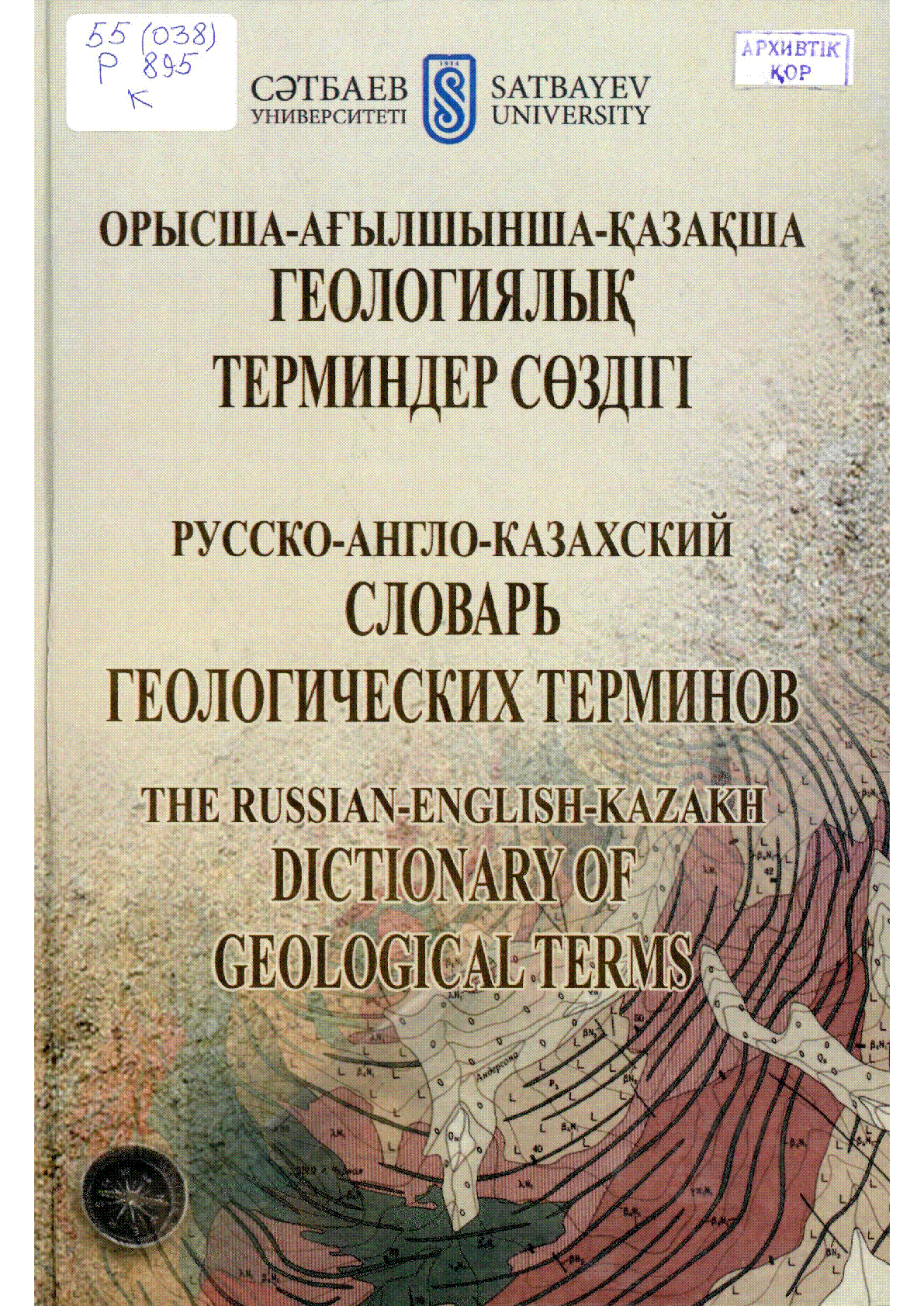 Русско-англо-казахский словарь геологических терминов [Текст] , = Орысша-ағылшынша-қазақша геологиялық терминдер сөздігі / ... – Алматы : Қазақ тілі, 2019. - 432 с. 22 см - Текст на рус., каз., англ. яз. . . – 150 экз. – 978-601-80756-1-2 : 1800.тг.