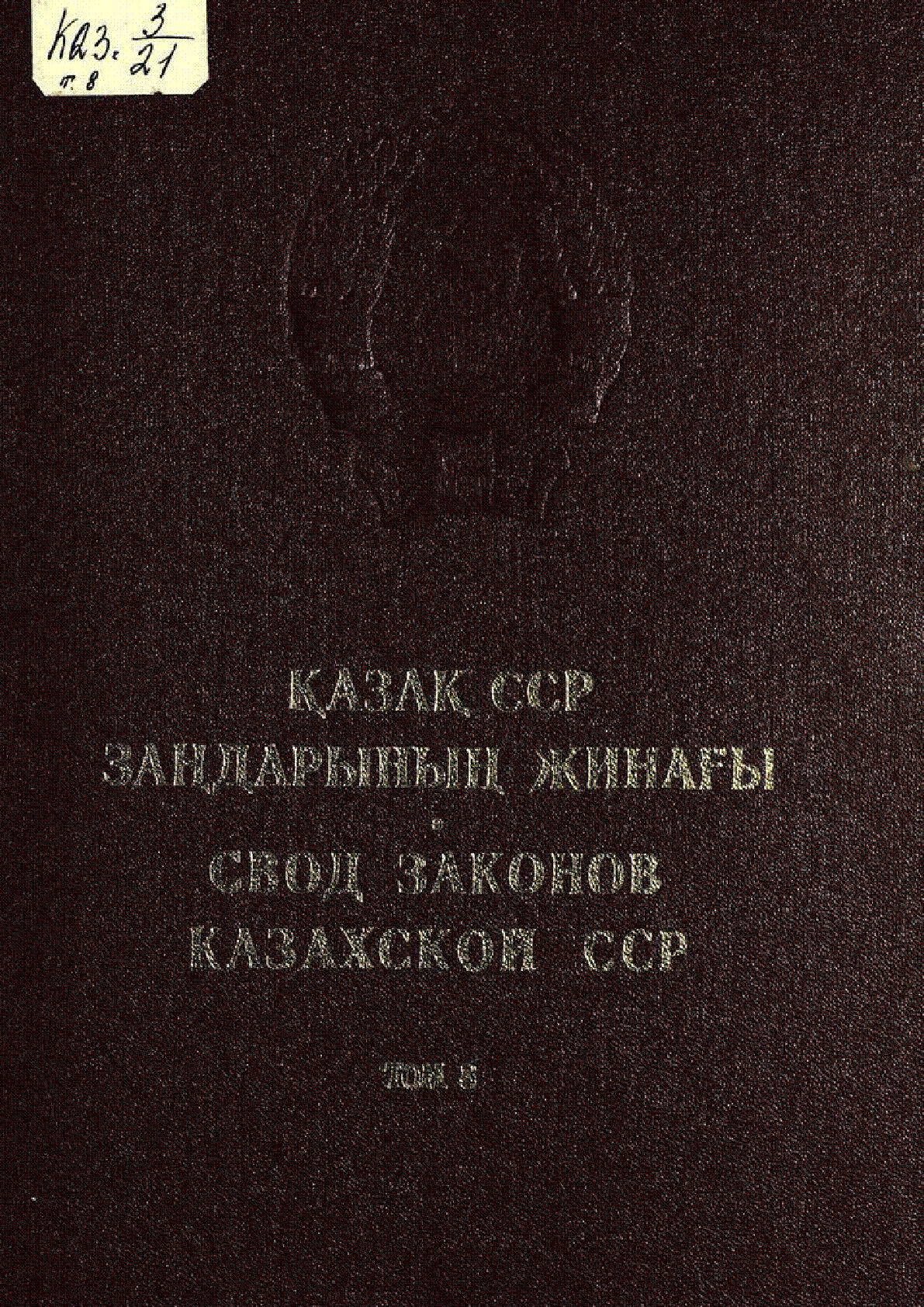 Қазақ ССР Заңдарының жинағы [Мәтін] ; [заңдарды басып шығар. жөніндегі комиссия: Д. Досполов [ж. б.]] ; Қазақ ССР Жоғарғы Советінің Президиумы ; Қазақ ССР Министрлер Советі .- Алматы : [б. ж.] , 1986.– 6800 дана . – - Мәтін қазақ, орыс тілд. . Библиогр. тақырып астында 8-том, VI-бөлім . Халық шаруашылығы туралы заңдар– 387 б.