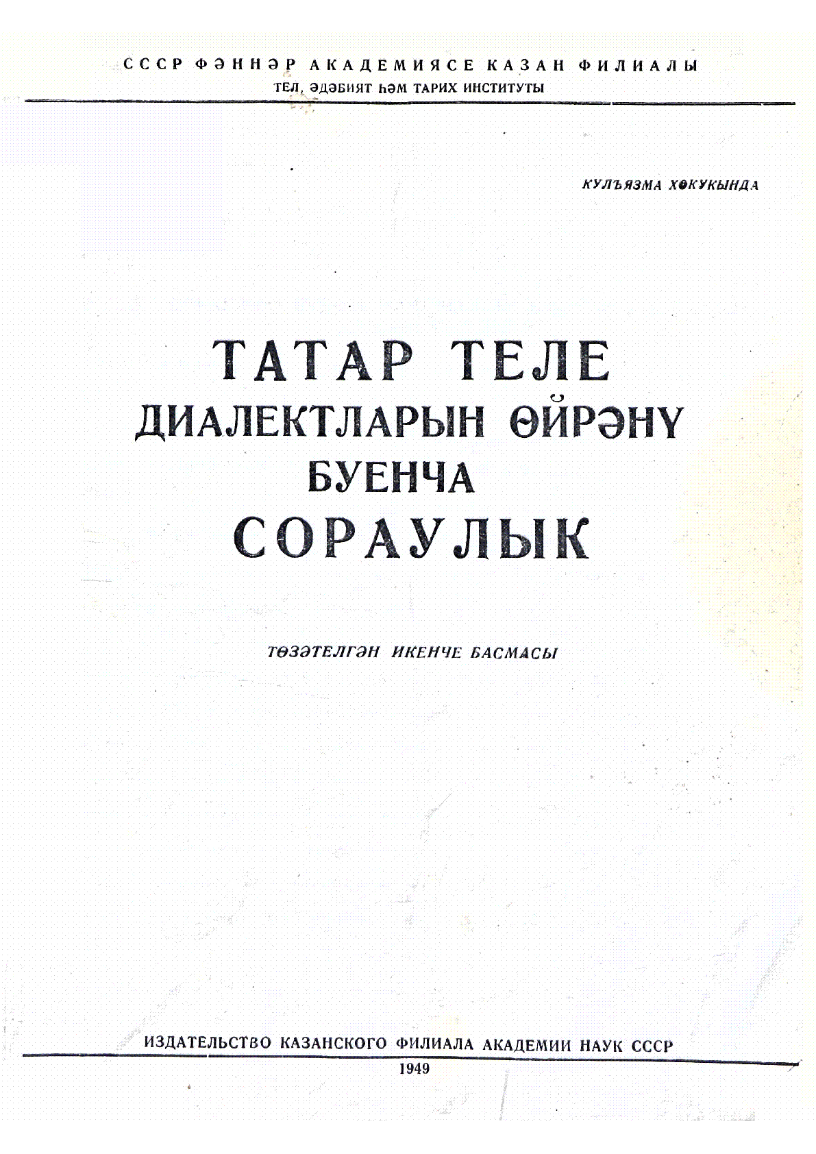 Татар теле диалектларын өйрәнү буенча сораулык [Text] / ; [СССР фәннәр академиясе Казан филиалы ; Тел, әдәбият һәм тарих ин-ты ; жаваплы ред. Л. Жәләй]. – 2-бас. ., төзәтелгән. – Казан : Изд-во Казанского фил. акад. наук СССР, 1949. - 75, [1] б. - Шора Сарыбаев қоры . . – 1000 дана : 0 тг.